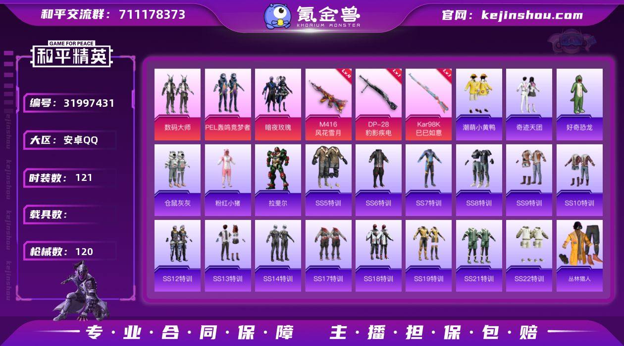 LK26333 安卓 手Q-3粉装-3特效枪-0载具-0粉色飞行器-39171热力值-1王牌印记-121套装-120枪皮 【热门品类】:旭日初心兜帽大衣,套装-潮萌小黄鸭,套装-粉红小猪 【粉色套装】:粉装-数码大师,粉装-PEL轰鸣竞梦者,粉装-暗夜玫瑰 【粉色枪皮等级】:M416-风花雪月(四级),Kar98K-巳巳如意(一级),DP-28-豹影疾电(一级) 【粉色枪皮】:M416-风花雪月,Kar98K-巳巳如意,DP-28-豹影疾电 【粉色降落伞】:至尊龙雀降落伞,春暖花开降落伞,天启纪元降落伞,四圣焕新降落伞,暗夜玫瑰降落伞 【稀有套装】:角色-拉斐尔 【稀有枪皮】:AKM-奇异狩猎者,AKM-灼热熔岩,AKM-破晓战魂,AKM-萌趣颜团子,AKM-虎虎生威,AKM-霓虹街区,AKM-龙的传人,M16A4-快乐主宰,SCAR-L-炫彩节奏,SCAR-L-玉兔迎春,SCAR-L-红色方程式,M416-仓鼠灰灰,M416-夜灯,M416-糯团青竹,GROZA-春暖花开,GROZA-生命誓言,GROZA-黑色刀锋,AUG-天降萌叽,AUG-耀粉歌者,QBZ-原初圣火,QBZ-彩虹符号,QBZ-神秘黑猫,M762-天降萌叽,M762-拳皇97,M762-牛气冲天,M762-瑞龙福将,Mk47-洛神天依,G36C-不夜海上花,G36C-暗夜玫瑰,蜜獾-天降萌叽,UZI-众神之王,UZI-天降萌叽,UZI-幻影战神,UZI-炫彩节奏,UMP45-春暖花开,Vector-PEL轰鸣竞梦者,Vector-生命誓言,Vector-银河战甲,Vector-黑色刀锋,汤姆逊-勇闯险境,汤姆逊-耀粉歌者,MP5K-众神之王,Kar98K-勇闯险境,Kar98K-华贵君王,M24-众神之王,M24-冰封烈焰,SKS-勇闯险境,SKS-夜灯,VSS-黑色刀锋,Mini14-原初圣火,Mini14-春暖花开,Mini14-梦幻火箭,Mini14-炫彩节奏,Mini14-金鼠迎春,Mini14-马卡龙,Win94-瑞龙福将,SLR-众神之王,QBU-不夜海上花,S686-不夜海上花,S686-冰封烈焰,S1897-勇闯险境,S1897-炫彩节奏,S12K-瑞龙福将,S12K-破晓战魂,M249-拳皇97,M249-破晓...