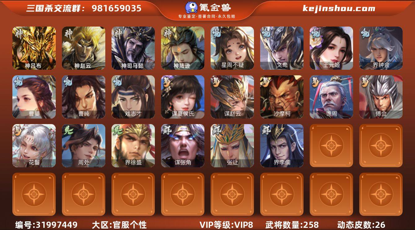 官阶:骠骑将军;VIP等级:VIP8;史诗武将数量:25;动态皮肤数量:26;武将总数:258;史诗宝珠数量:0;将魂数量:7273;神将:4;魏国史诗武将:14;蜀国史诗武将:6;吴国史诗武将:2;群史诗武将:4