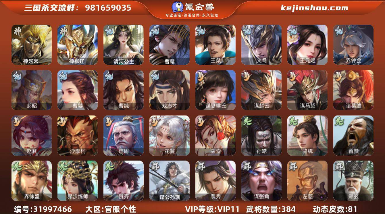 官阶:大将军;VIP等级:VIP11;史诗武将数量:48;动态皮肤数量:81;武将总数:384;史诗宝珠数量:0;将魂数量:6808;神将:4;魏国史诗武将:24;蜀国史诗武将:9;吴国史诗武将:6;群史诗武将:24 神赵云,神张辽,神吕蒙,神周瑜,曹髦,王粲,文鸯,王元姬,界钟会,郝昭,曹婴,曹纯,戏志才,清河公主,关索,谋夏侯氏,谋赵云,谋马超,诸葛瞻,赵襄,沙摩柯,谯周,花鬘,孙皓,骆统,留赞,界徐盛,界步练师,贺齐,谋黄月英,谋公孙瓒,裴秀,左慈,郑玄,张让,星黄忠,星甘宁,苏飞,麹义,庞德公,南华老仙,沮授,界左慈,界李儒,公孙康,杜预,鲍信,谋张角,张绣,李傕,阎象,许攸,友徐庶,神太史慈-勇撼日月(动态),神张辽-散敌擒孙,神甘宁-万人辟易(动态),神赵云-战龙在野(动态),钟会-龙年端午(动态),钟会-潜蛟觊天(动态),SP蔡文姬-兔年冬日(动态),甄姬-牛年清明(动态),荀彧-驱虎吞狼(动态),邓艾-神兵天降(动态),界邓艾-神兵天降(动态),于禁-威严毅重(动态),戏志才-举棋若定(动态),曹婴-锋芒毕露(动态),曹纯-虎年春节(动态),王元姬-鼠年冬至(动态),清河公主-魅影萦心(动态),花鬘-依心缱绻(动态),诸葛亮-龙年限定(动态),费祎-安民护祚(动态),刘备-明良千古(动态),关羽-明良千古(动态),马超-虎年冬至(动态),黄月英-明良千古(动态),诸葛亮-明良千古(动态),诸葛瞻-绵竹之殇(动态),界刘备-明良千古(动态),界黄月英-明良千古(动态),SP孙尚香-猪年圣诞(动态),关索-鼠年中秋(动态),李丰-太仓聚粟(动态),孙策-兔年中秋(动态),周处-义除三害(动态),陆逊-龙年七夕(动态),黄盖-兔年端午(动态),孙权-牛年七夕(动态),孙权-冠绝天下(动态),孙尚香-兔年春节(动态),孙尚香-星流霆击(动态),孙策-长沙桓王(动态),小乔-猪年大雪(动态),界孙权-牛年七夕(动态),界孙尚香-星流霆击(动态),界小乔-猪年大雪(动态),界孙策-长沙恒王(动态),徐盛-破军杀将(动态),步练师-牛年七夕(动...