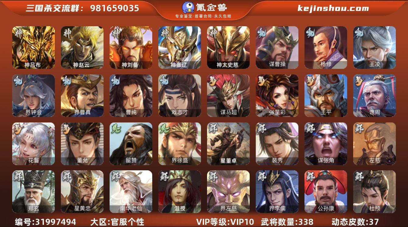 官阶:骠骑将军;VIP等级:VIP10;史诗武将数量:36;动态皮肤数量:37;武将总数:338;史诗宝珠数量:0;将魂数量:7036;神将:7;魏国史诗武将:22;蜀国史诗武将:6;吴国史诗武将:2;群史诗武将:15
