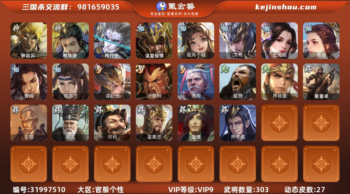 官阶:骠骑将军;VIP等级:VIP9;史诗武将数量:26;动态皮肤数量:27;武将总数:303;史诗宝珠数量:9;将魂数量:4356;神将:4;魏国史诗武将:14;蜀国史诗武将:3;吴国史诗武将:2;群史诗武将:8 神赵云,神陆逊,神甘宁,神吕蒙,星周不疑,文鸯,王元姬,魏-司马昭,曹婴,曹纯,戏志才,谋夏侯惇,谋赵云,沙摩柯,谯周,留赞,界徐盛,左慈,郑玄,星黄忠,麹义,沮授,界李儒,许攸,星董卓,神甘宁-万人辟易(动态),神陆逊-绽焰摧枯(动态),神吕蒙-兼资文武(动态),神诸葛亮-观星唤雨,神曹操-天下归心,星周不疑-才广志宏(动态),张昌蒲-龙年端午(动态),钟繇-安民护祚(动态),曹丕-气荡山河(动态),甄姬-明珠耀躯(动态),司马昭-昭威淮南(动态),清河公主-魅影萦心(动态),关银屏-兔年春节(动态),周处-义除三害(动态),吕蒙-剑起惊澜(动态),孙权-牛年七夕(动态),孙尚香-兔年春节(动态),周妃-笼中箜响(动态),界孙权-牛年七夕(动态),徐盛-破军杀将(动态),刘赞-灵魂歌王(动态),文鸯-势若万钧(动态),曹节-龙年中秋(动态),李儒-鸠杀少帝(动态),界李儒-鸠杀少帝(动态)