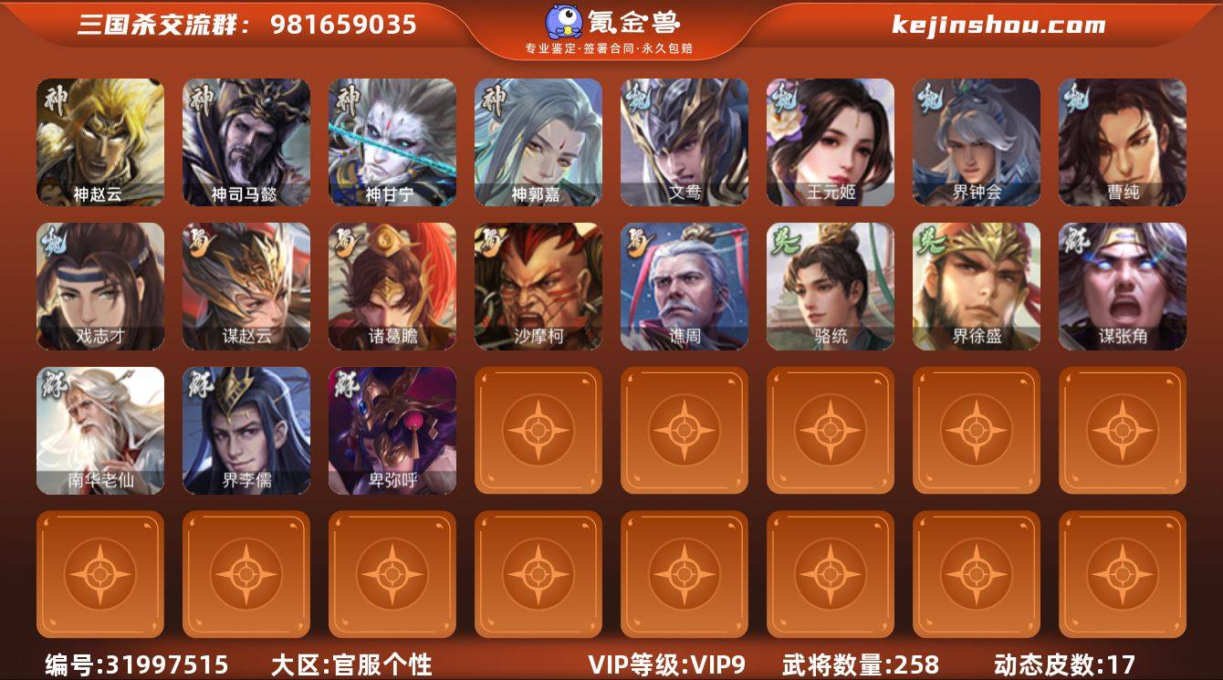 VIP等级: VIP11 官阶: 大将军 武将数量: 338 动态皮肤数量: 39 神将: 神吕布,神太史慈,神荀彧,神赵云,神吕蒙,神周瑜,神诸葛亮 魏国武将: 戏志才,曹纯,曹婴,程昱,郝昭,嵇康,界曹真,界钟会,魏-司马昭,王元姬,文鸯,杨修,张辽,SP蔡文姬,SP曹仁,SP关羽,SP贾诩,SP姜维,SP庞德,卞夫人,蔡贞姬,曹昂,曹操,曹冲,曹洪,曹丕,曹仁,曹叡,曹嵩,王异,张恭,鲁芝,界满宠,曹休,界曹植,满宠,荀攸,钟繇,郭嘉,牵招,荀彧,阮慧,杜畿,界郭嘉,崔琰,界曹丕,界荀彧,朱灵,界甄姬,吕虔,界王异,界许褚,华歆,陈群,界邓艾,界曹休,袁涣,李通,乐进,辛宪英,郭淮,郭皇后,夏侯惇,曹植,司马朗,界曹操,星周不疑,许褚,界张辽,张郃,钟会,文聘,曹彰,界夏侯惇,诸葛诞,司马懿,甄姬,杨阜,徐晃,孙资刘放,韩浩史涣,胡班,曹真,典韦,界夏侯渊,谋荀彧,夏侯渊,李典,于禁,王双,邓艾,界司马懿,臧霸,牛金,朱灵(国战),谋张辽,谋夏侯渊 蜀国武将: 董允,花鬘,谯周,沙摩柯,谋马超,谋赵云,谋夏侯氏,马云騄,谋黄月英,徐庶,界魏延,界关羽,邓芝,界伊籍,严颜,界张嶷,赵云,张松,彭羕,李丰,界刘备,刘封,谋庞统,黄月英,刘巴,关羽,王甫赵累,吴懿,吴班,祝融,张飞,黄皓,魏延,马忠,界法正,糜夫人,刘禅,界赵云,关银屏,SP孙尚香,SP徐庶,卧龙诸葛,宗预,周仓,简雍,界关兴张苞,诸葛亮,界卧龙诸葛,法正,陈到,界马岱,关平,马岱,界庞统,庞统,诸葛果,谋张飞,马谡,马超,廖化,关兴张苞,孟获,夏侯氏,姜维,黄忠,刘备,马良,蒋琬费祎,许靖,刘谌,彭羕(国战),甘夫人,SP甘夫人,势陈到 吴国武将: 界徐盛,骆统,文鸯,潘濬,张温,周泰,全琮,吕蒙,诸葛恪,界孙尚香,界顾雍,大乔小乔,桥公,谋周瑜,许贡,丁奉,界全琮,孙茹,蒋钦,顾雍,孙亮,界朱治,孙休,严畯,界孙权,孙翊,祖茂,濮阳兴,步骘,界吕蒙,陆抗,孙登,凌操,朱治,孙尚香,程普,大乔,韩当,陆逊,诸葛瑾,朱然,吕范,太史慈,虞翻,界黄盖,孙鲁班,界周瑜,界潘璋马忠,孙权,界...