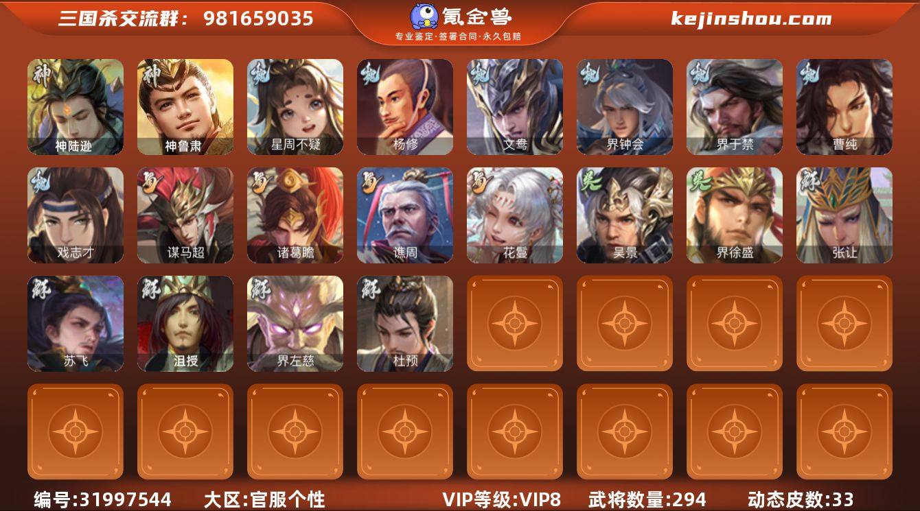 官阶:骠骑将军;VIP等级:VIP8;史诗武将数量:23;动态皮肤数量:33;武将总数:294;史诗宝珠数量:22;将魂数量:3287;神将:4;魏国史诗武将:10;蜀国史诗武将:4;吴国史诗武将:2;群史诗武将:6