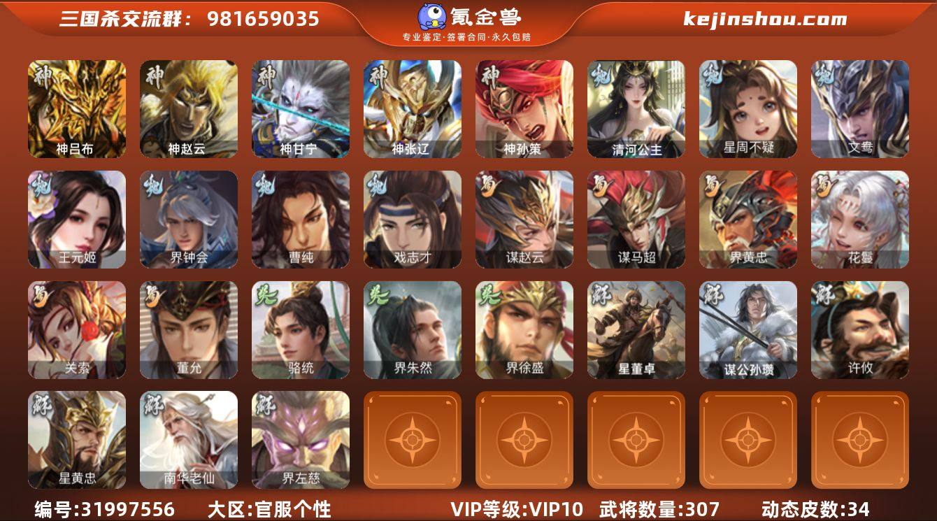 官阶:骠骑将军;VIP等级:VIP10;史诗武将数量:30;动态皮肤数量:34;武将总数:307;史诗宝珠数量:0;将魂数量:456;神将:5;魏国史诗武将:10;蜀国史诗武将:6;吴国史诗武将:3;群史诗武将:8 神吕布,神赵云,神甘宁,神张辽,神孙策,星周不疑,文鸯,王元姬,界钟会,曹纯,戏志才,清河公主,关索,谋赵云,谋马超,界黄忠,花鬘,董允,骆统,界朱然,界徐盛,谋公孙瓒,星黄忠,麹义,南华老仙,界左慈,阎象,许攸,星董卓,神鲁肃-九州为局,神孙策-霸王再世(动态),神甘宁-万人辟易(动态),神赵云-战龙在野(动态),星周不疑-才广志宏(动态),SP蔡文姬-兔年冬日(动态),曹昂-竭战麟伤(动态),王元姬-鼠年冬至(动态),清河公主-魅影萦心(动态),花鬘-依心缱绻(动态),关羽-明良千古(动态),马超-虎年冬至(动态),张飞-明良千古(动态),关索-虎年七夕(动态),诸葛果-蛇年限定(动态),孙茹-龙年七夕(动态),周处-义除三害(动态),孙权-兔年中秋(动态),周瑜-兔年七夕(动态),孙权-吴王六剑(动态),孙尚香-兔年春节(动态),界孙权-吴王六剑(动态),徐盛-破军杀将(动态),灵雎-霜刃绚练(动态),貂蝉-忧君难寐(动态),麹义-扬刀立威(动态),左慈-蛇年限定(动态)