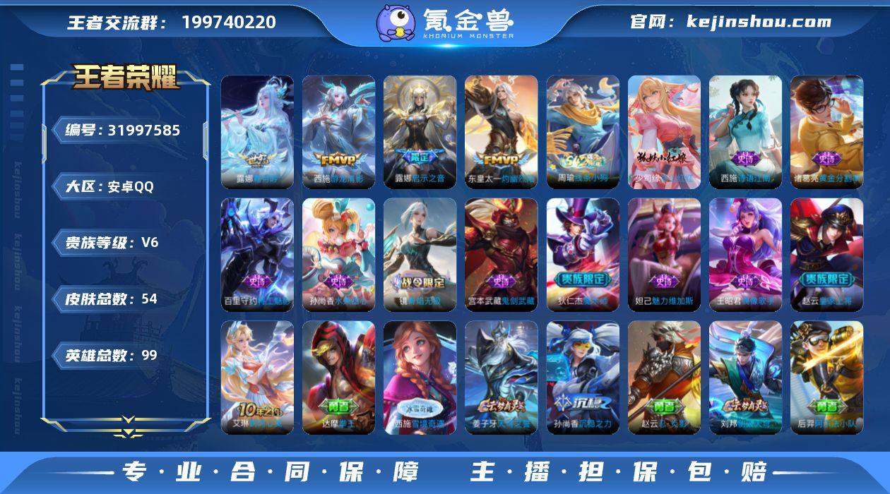 实名: 可修改 性别: 男号 贵族等级: V6 英雄数: 99 皮肤数: 54 传说皮: 游龙清影,灼幽烈阳,霜月吟 限定皮: 启示之音