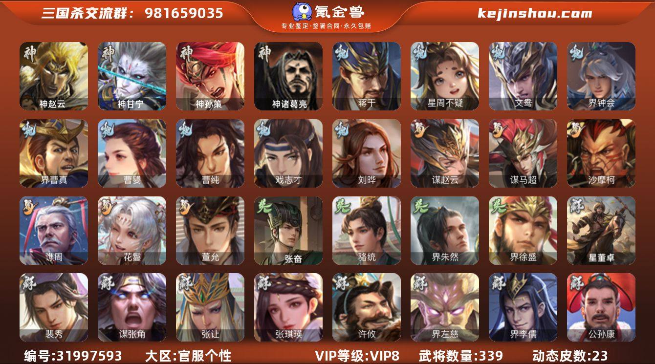 官阶:骠骑将军;VIP等级:VIP8;史诗武将数量:35;动态皮肤数量:23;武将总数:339;史诗宝珠数量:2;将魂数量:6415;神将:4;魏国史诗武将:12;蜀国史诗武将:6;吴国史诗武将:4;群史诗武将:15 神赵云,神甘宁,神孙策,神诸葛亮,星周不疑,文鸯,魏-司马昭,界钟会,界曹真,曹婴,曹纯,戏志才,刘晔,蒋干,谋赵云,谋马超,沙摩柯,谯周,花鬘,董允,张奋,骆统,界朱然,界徐盛,谋黄月英,裴秀,张让,张琪瑛,麹义,界左慈,界李儒,公孙康,鲍信,谋张角,张绣,李傕,阎象,许攸,星董卓,神孙策-霸王再世(动态),神张辽-散敌擒孙,神甘宁-万人辟易(动态),神赵云-战龙在野(动态),曹丕-气荡山河(动态),曹丕-龙年中秋(动态),SP蔡文姬-兔年冬日(动态),许褚-兔年端午(动态),司马昭-昭威淮南(动态),诸葛诞-寿春举义(动态),费祎-安民护祚(动态),关羽-明良千古(动态),卧龙诸葛-火烧博望(动态),周处-义除三害(动态),孙权-永开吴祚(动态),徐盛-破军杀将(动态),刘赞-灵魂歌王(动态),文鸯-势若万钧(动态),高顺-每战必克(动态),许攸-火烧乌巢(动态),袁绍-声震寰宇(动态),高览-威显官渡(动态),麹义-扬刀立威(动态)