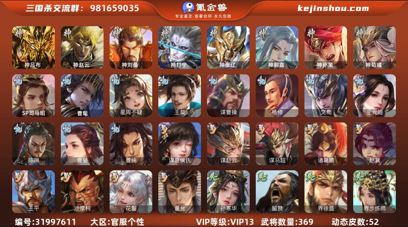 官阶:大将军;VIP等级:VIP13;史诗武将数量:44;动态皮肤数量:52;武将总数:369;史诗宝珠数量:5;将魂数量:3654;神将:10;魏国史诗武将:20;蜀国史诗武将:9;吴国史诗武将:4;群史诗武将:12