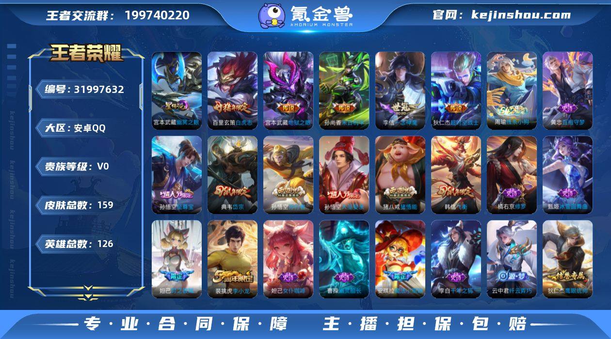 贵族等级:V0 典藏皮肤数:0 珍品无双皮肤数:0 无双皮肤数:0 珍品传说皮肤数:0 传说皮肤数:5 史诗皮肤数:46 皮肤数:159 英雄数:126 段位:钻石 卖家说:有个荣耀水晶没换
