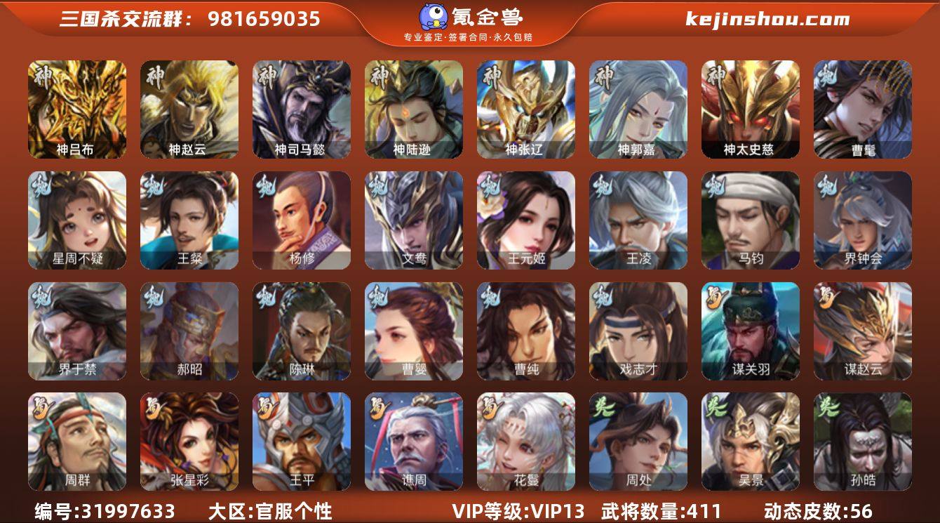 官阶:大将军;VIP等级:VIP13;史诗武将数量:58;动态皮肤数量:56;武将总数:411;史诗宝珠数量:5;将魂数量:2362;神将:10;魏国史诗武将:26;蜀国史诗武将:7;吴国史诗武将:7;群史诗武将:22 神吕布,神赵云,神司马懿,神陆逊,神张辽,神郭嘉,神太史慈,神关羽,神吕蒙,神周瑜,曹髦,星周不疑,王粲,杨修,文鸯,王元姬,王凌,魏-司马昭,马钧,界钟会,界于禁,郝昭,陈琳,曹婴,曹纯,戏志才,谋赵云,周群,张星彩,王平,谯周,花鬘,谋关羽,周处,吴景,孙皓,骆统,留赞,界朱然,界徐盛,谋郭嘉,左慈,张让,张琪瑛,杨彪,星黄忠,苏飞,司马徽,审配,麹义,南华老仙,刘焉,沮授,界左慈,界李儒,公孙康,杜预,谋张角,张绣,阎象,许攸,星董卓,神郭嘉-虎年清明(动态),神曹操-天下归心,星周不疑-才广志宏(动态),钟会-龙年端午(动态),曹丕-气荡山河(动态),甄姬-明珠耀躯(动态),SP蔡文姬-兔年冬日(动态),戏志才-举棋若定(动态),曹婴-兔年春节(动态),曹婴-锋芒毕露(动态),曹纯-虎年春节(动态),王元姬-鼠年冬至(动态),司马师-牛年中秋(动态),司马昭-昭威淮南(动态),张辽-龙生九子(动态),马超-虎年冬至(动态),马超-明良千古(动态),诸葛亮-明良千古(动态),界诸葛亮-明良千古(动态),关银屏-虎年端午(动态),张星彩-虎年端午(动态),周处-义除三害(动态),吕蒙-剑起惊澜(动态),陆逊-龙年七夕(动态),孙权-永开吴祚(动态),周瑜-兔年七夕(动态),徐盛-破军杀将(动态),孙茹-烟水悠悠(动态),刘赞-灵魂歌王(动态),鲁肃-蛇年端午(动态),文鸯-势若万钧(动态),高顺-每战必克(动态),灵雎-霜刃绚练(动态),袁绍-声震寰宇(动态),麹义-扬刀立威(动态),杜预-龙吟破竹(动态),左慈-役使鬼神(动态),许攸-盛气凌人(动态),李儒-鸠杀少帝(动态),界李儒-鸠杀少帝(动态),刘焉-雄踞益州(动态),星甘宁-锦帆游侠(动态)
