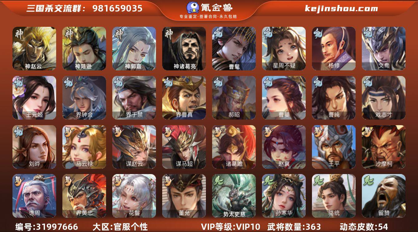 VIP等级: VIP10 官阶: 大将军 武将数量: 333 动态皮肤数量: 8 神将: 神甘宁,神郭嘉,神陆逊,神吕布,神赵云 魏国武将: 戏志才,曹纯,程昱,嵇康,界钟会,王朗,王元姬,文鸯,杨修,唐咨-魏,张辽,SP蔡文姬,SP曹仁,SP关羽,SP贾诩,SP姜维,SP庞德,卞夫人,曹昂,曹操,曹冲,曹洪,曹丕,曹仁,曹叡,王异,鲁芝,界满宠,满宠,荀攸,钟繇,郭嘉,牵招,荀彧,阮慧,杜畿,界郭嘉,崔琰,界荀彧,朱灵,吕虔,界陈群,界王异,界许褚,界郭淮,华歆,陈群,界典韦,袁涣,李通,乐进,辛宪英,郭淮,毛玠,郭皇后,夏侯惇,曹植,司马朗,谋于禁,界曹操,星周不疑,许褚,界张辽,谋徐晃,张郃,钟会,文聘,曹彰,界夏侯惇,诸葛诞,司马懿,甄姬,徐晃,孙资刘放,韩浩史涣,胡班,曹真,典韦,界夏侯渊,夏侯渊,李典,于禁,邓艾,界司马懿,张春华,孟达-魏,臧霸,牛金,朱灵(国战),董昭 蜀国武将: 花鬘,傅佥,谯周,诸葛瞻,谋赵云,马云騄,徐庶,杨仪,界关羽,界诸葛亮,邓芝,界伊籍,严颜,界黄月英,界张嶷,赵云,张松,彭羕,李丰,界刘备,刘封,糜竺,谋庞统,黄月英,刘巴,关羽,王甫赵累,吴懿,祝融,张飞,黄皓,魏延,界周仓,马忠,界法正,糜夫人,刘禅,界赵云,谋诸葛亮,张翼,关银屏,SP孙尚香,SP徐庶,卧龙诸葛,周仓,简雍,界关兴张苞,诸葛亮,界张飞,法正,赵统赵广,陈到,界马岱,关平,马岱,界庞统,庞统,诸葛果,谋张飞,马谡,马超,廖化,关兴张苞,孟获,夏侯氏,姜维,黄忠,刘备,界马超,李严,马良,蒋琬费祎,蜀-孟达,彭羕(国战),甘夫人,蜀-糜芳傅士仁,SP甘夫人,势陈到 吴国武将: 界步练师,界徐盛,留赞,周处,文鸯,潘濬,张温,周泰,全琮,吕蒙,诸葛恪,界孙尚香,大乔小乔,桥公,许贡,丁奉,谋吕蒙,界全琮,孙茹,蒋钦,顾雍,孙亮,界朱治,孙休,严畯,界孙权,孙翊,界孙休,界凌统,祖茂,濮阳兴,界吕蒙,陆抗,孙登,凌操,朱治,孙尚香,程普,大乔,韩当,陆逊,诸葛瑾,朱然,太史慈,周妃,虞翻,界孙坚,界黄盖,孙鲁班,界周瑜,界潘璋马忠,卫温诸葛直,...