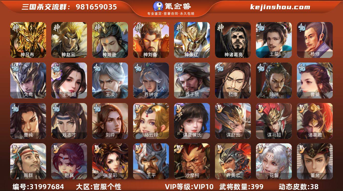 官阶:大将军;VIP等级:VIP10;史诗武将数量:56;动态皮肤数量:38;武将总数:399;史诗宝珠数量:24;将魂数量:6262;神将:9;魏国史诗武将:18;蜀国史诗武将:13;吴国史诗武将:7;群史诗武将:18