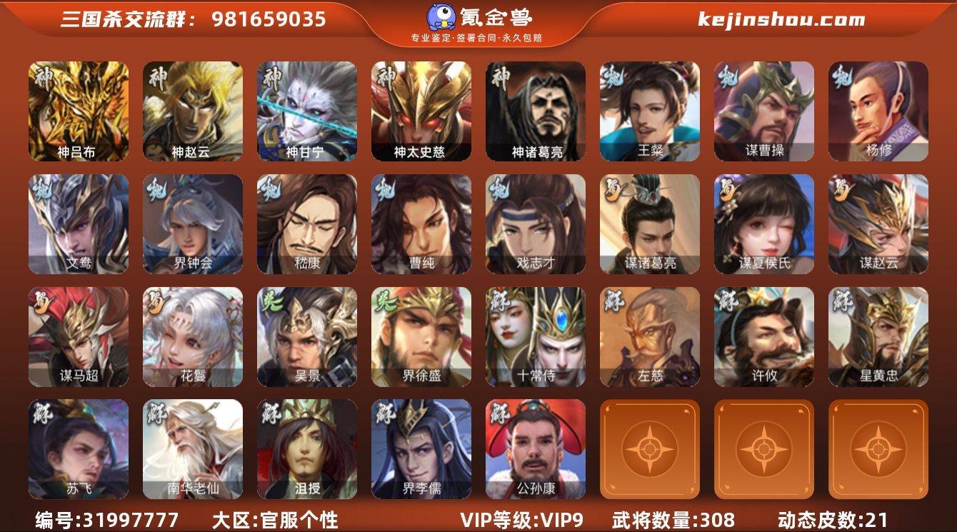 官阶:骠骑将军;VIP等级:VIP9;史诗武将数量:31;动态皮肤数量:21;武将总数:308;史诗宝珠数量:0;将魂数量:4325;神将:7;魏国史诗武将:15;蜀国史诗武将:5;吴国史诗武将:2;群史诗武将:11 神吕布,神赵云,神甘宁,神太史慈,神吕蒙,神周瑜,神诸葛亮,王粲,谋曹操,杨修,文鸯,界钟会,嵇康,曹纯,戏志才,谋诸葛亮,谋夏侯氏,谋赵云,谋马超,花鬘,吴景,界徐盛,十常侍,左慈,星黄忠,苏飞,麹义,南华老仙,沮授,界李儒,公孙康,张绣,许攸,神诸葛亮-剑祭通天(动态),神吕布-冠绝天下(动态),星周不疑-龙年清明(动态),SP蔡文姬-兔年冬日(动态),王粲-笔翰如流(动态),钟会-谋谟之勋(动态),曹真-虎年春节(动态),界钟会-谋谟之勋(动态),程昱-泰山捧日(动态),戏志才-举棋若定(动态),刘备-龙御天下(动态),马超-明良千古(动态),关银屏-兔年春节(动态),李丰-太仓聚粟(动态),卧龙诸葛-火烧博望(动态),黄盖-兔年端午(动态),孙策-虎踞江东(动态),灵雎-霜刃绚练(动态),许攸-火烧乌巢(动态),吕布-傲睨万物(动态),苏飞-肝胆相照(动态)