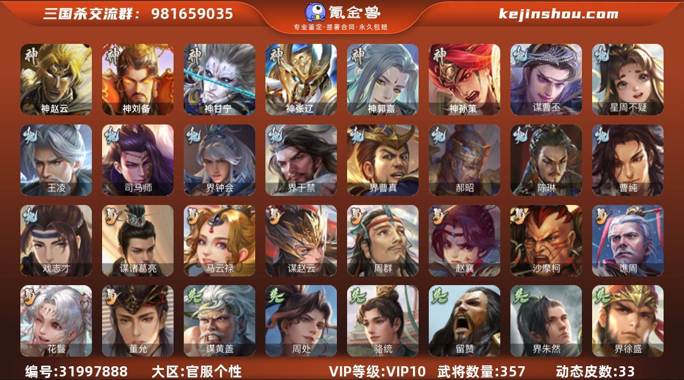 官阶:大将军;VIP等级:VIP9;史诗武将数量:35;动态皮肤数量:38;武将总数:328;史诗宝珠数量:0;将魂数量:2595;神将:5;魏国史诗武将:21;蜀国史诗武将:7;吴国史诗武将:3;群史诗武将:12 神赵云,神陆逊,神甘宁,神孙策,神周瑜,曹髦,星周不疑,文鸯,王元姬,魏-司马昭,界钟会,界于禁,曹婴,曹纯,戏志才,谋赵云,谋马超,诸葛瞻,沙摩柯,谯周,花鬘,董允,界徐盛,贺齐,势太史慈,十常侍,裴秀,左慈,星黄忠,沮授,界李儒,鲍信,谋张角,李傕,许攸,友徐庶,星董卓,神孙策-霸王再世(动态),神甘宁-万人辟易(动态),神曹操-天下归心,星周不疑-才广志宏(动态),曹丕-气荡山河(动态),星周不疑-龙年清明(动态),甄姬-明珠耀躯(动态),SP蔡文姬-兔年冬日(动态),张春华-牛年立冬(动态),朱灵-以战破氐(动态),曹纯-虎年春节(动态),曹纯-长坂败备(动态),司马昭-昭威淮南(动态),星徐晃-斧引霹雳(动态),刘备-龙御天下(动态),诸葛亮-龙年限定(动态),费祎-安民护祚(动态),关索-依心缱绻(动态),周处-义除三害(动态),吕蒙-剑起惊澜(动态),孙权-永开吴祚(动态),孙策-虎踞江东(动态),周瑜-免年清明(动态),孙权-吴王六剑(动态),界孙权-吴王六剑(动态),文鸯-势若万钧(动态),高顺-每战必克(动态),许攸-火烧乌巢(动态),袁绍-声震寰宇(动态),麹义-扬刀立威(动态),杜预-龙吟破竹(动态),陶谦-安民护祚(动态)