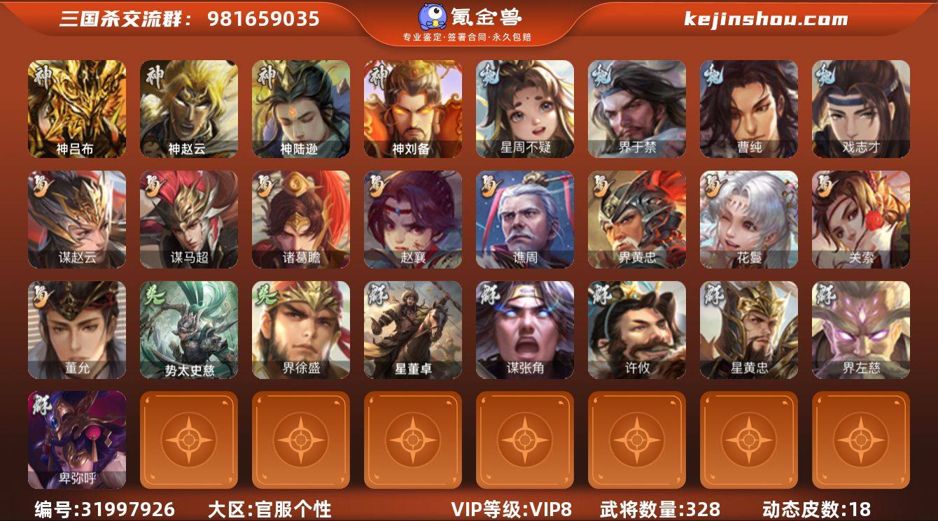 官阶:骠骑将军;VIP等级:VIP8;史诗武将数量:28;动态皮肤数量:18;武将总数:328;史诗宝珠数量:25;将魂数量:958;神将:6;魏国史诗武将:8;蜀国史诗武将:9;吴国史诗武将:2;群史诗武将:9 神吕布,神赵云,神陆逊,神刘备,神吕蒙,神周瑜,星周不疑,界于禁,曹纯,戏志才,关索,谋赵云,谋马超,诸葛瞻,赵襄,谯周,界黄忠,花鬘,董允,界徐盛,势太史慈,谋黄月英,星黄忠,麹义,界左慈,卑弥呼,谋张角,李傕,许攸,星董卓,神吕蒙-心生万象,郭嘉-以身证道(动态),星周不疑-才广志宏(动态),曹丕-气荡山河(动态),SP蔡文姬-兔年冬日(动态),诸葛亮-龙年限定(动态),费祎-安民护祚(动态),黄月英-木牛流马(动态),界黄月英-木牛流马(动态),关索-虎年七夕(动态),卧龙诸葛-火烧博望(动态),黄盖-兔年端午(动态),孙权-永开吴祚(动态),袁绍-声震寰宇(动态),左慈-役使鬼神(动态),皇甫嵩-奋钺振旅(动态),陶谦-安民护祚(动态),左慈-蛇年限定(动态)