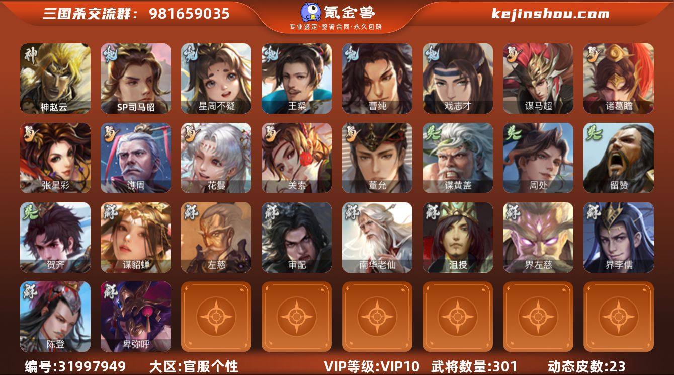 【3870】官阶:中军将军;VIP等级:VIP4;史诗武将数量:8;动态皮肤数量:3;武将总数:196;史诗宝珠数量:80;将魂数量:2280;神将:1;魏国史诗武将:4;蜀国史诗武将:2;吴国史诗武将:0;群史诗武将:2 神华佗,界钟会,戏志才,程昱,谯周,花鬘,麹义,公孙康,神吕蒙,SP关羽,曹昂,诸葛诞,朱灵,文聘,SP姜维,张春华,钟会,曹冲,郭淮,满宠,界王异,界曹操,界司马懿,界夏侯惇,界张辽,界许褚,界郭嘉,李典,曹真,韩浩史涣,陈群,曹叡,钟繇,司马朗,郭皇后,吕虔,界荀彧,界曹丕,界曹植,卞夫人,崔琰,势陈到,SP孙尚香,关银屏,夏侯霸,马良,关兴张苞,廖化,界马岱,关平,刘封,界法正,界关兴张苞,界刘备,界张飞,界赵云,SP徐庶,吴懿,周仓,张松,刘谌,夏侯氏,李严,界黄月英,界伊籍,吕凯,傅肜,界简雍,诸葛果,甘夫人,凌操,诸葛恪,诸葛瑾,孙鲁育,程普,韩当,潘璋马忠,虞翻,朱然,界甘宁,界吕蒙,界黄盖,界周瑜,界大乔,界陆逊,孙鲁班,朱桓,顾雍,朱治,阚泽,潘濬,吕岱,许贡,界凌统,界韩当,孙翊,谋韩当,谋吕蒙,界孙休,界朱治,张布,孟达,友庞统,伏完,界袁术,SP赵云,张宝,伏皇后,李儒,华雄,袁术,界华佗,公孙瓒,蔡夫人,公孙渊,张鲁,刘虞,界貂蝉,SP太史慈,界高顺,界公孙瓒,韩遂,谋刘赪,王濬,谋华雄,势田丰,钟会-谋谟之勋(动态),曹昂-竭战麟伤(动态),鲁肃-蛇年端午(动态)