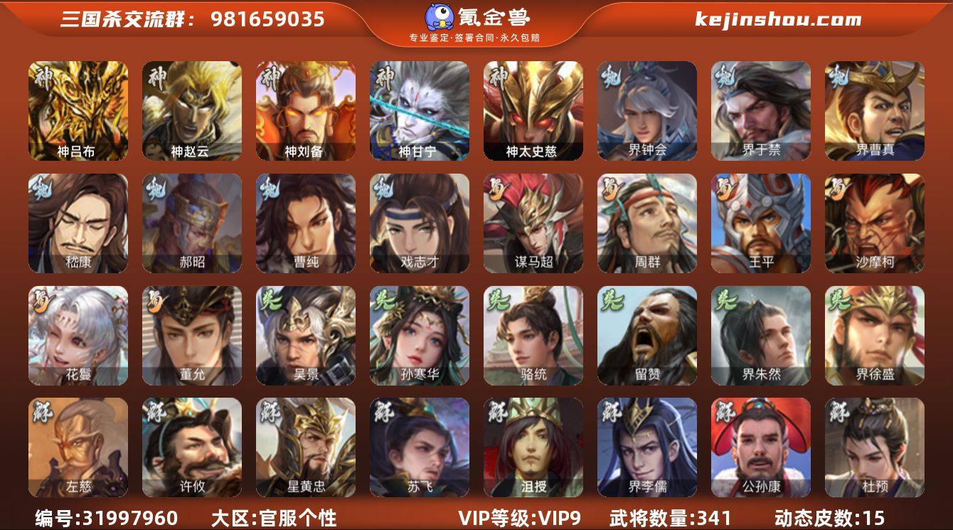 官阶:大将军;VIP等级:VIP9;史诗武将数量:35;动态皮肤数量:15;武将总数:341;史诗宝珠数量:52;将魂数量:8343;神将:6;魏国史诗武将:8;蜀国史诗武将:6;吴国史诗武将:6;群史诗武将:14 神吕布,神赵云,神刘备,神甘宁,神太史慈,神周瑜,界钟会,界于禁,界曹真,嵇康,郝昭,曹纯,戏志才,谋马超,周群,王平,沙摩柯,花鬘,董允,吴景,孙寒华,骆统,留赞,界朱然,界徐盛,谋黄月英,左慈,星黄忠,苏飞,麹义,沮授,界李儒,公孙康,杜预,鲍信,张绣,李傕,阎象,许攸,神甘宁-万人辟易(动态),曹丕-气荡山河(动态),星周不疑-龙年清明(动态),SP蔡文姬-兔年冬日(动态),戏志才-举棋若定(动态),刘备-龙御天下(动态),关羽-明良千古(动态),SP孙尚香-猪年圣诞(动态),鲍三娘-虎年七夕(动态),李丰-太仓聚粟(动态),周处-义除三害(动态),孙寒华-莲华熠熠(动态),徐盛-破军杀将(动态),步练师-牛年七夕(动态),孙茹-烟水悠悠(动态),刘赞-灵魂歌王(动态),貂蝉-鼠年七夕(动态),界貂蝉-鼠年七夕(动态)