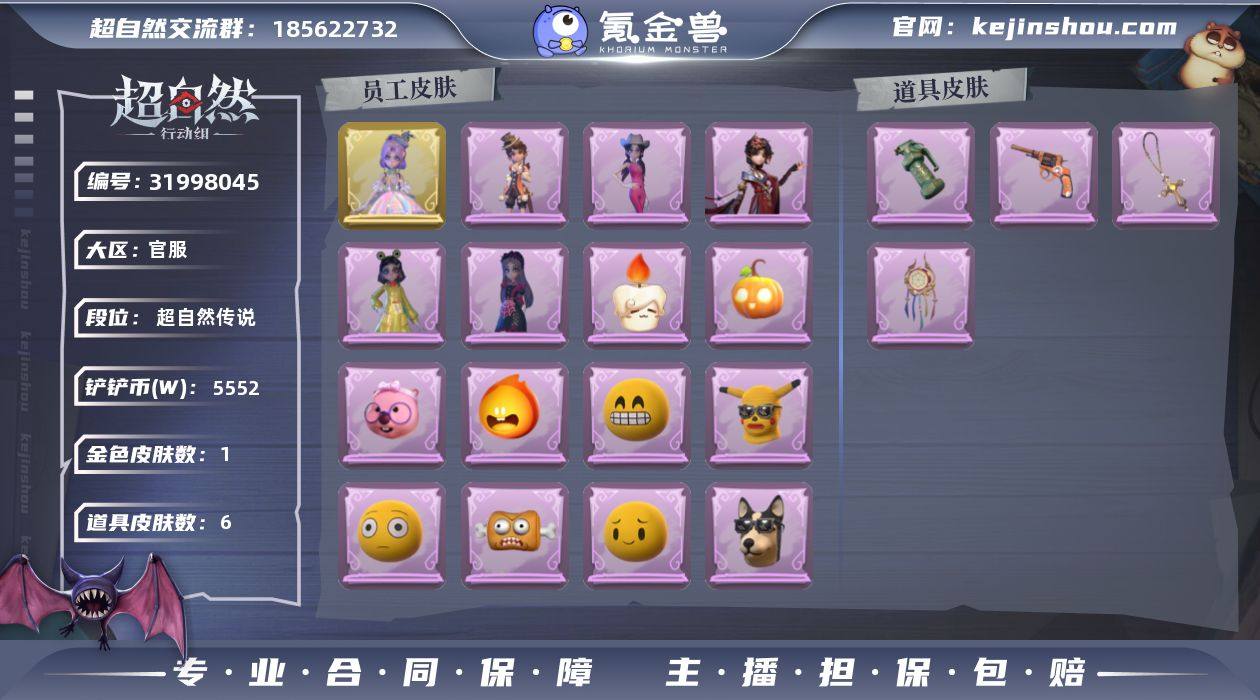 【czr53】金皮1;紫皮12;道具皮9;皮肤:逍遥-莲华渡,莉莉-莓果陷阱,艾伦-黎明猎手,薇薇安-白光莹,爱丽丝-丝缕哀歌,薇薇安-仙锋小姐,爱丽丝-甜梦派对,零-搬开山,阿念-迷途僵宝,小黄-呱呱雨衣,零-青云逸歌,逍遥-绣春逍影,阿念-王子与骑士;道具:腰包-宝剑八,长枪-罪棘,长鞭-小狗蛇点点鞭,刺刀-碧络琅环,急救包-蔷薇物语,转轮手枪-新星时代,夜视仪-金丝眼镜,短管猎枪-星光的裁决,音响-鸣沙鼓;饰品:头饰-太空鲨头套,头饰-卑微头套,头饰-烈焰红唇头套,头饰-呆滞头套,头饰-大葱明头套,头饰-惊魂南瓜头套,头饰-鱼头怪头套,头饰-樱桃奶油布丁,头饰-哈士奇头套,头饰-嘻嘻头套,头饰-萨卡班甲鱼头套,头饰-鳄霸天头套,头饰-火爆了头套,头饰-炙热烧烤,头饰-面具马头套,头饰-滑稽头套,头饰-雪墩墩头套,头饰-像素朋克墨镜,头饰-后室幸存者头套,挂饰-未竟乐园,挂饰-钗头凤,挂饰-晚安小熊,挂饰-天使消失的年代,背饰-潮汐小海兔,背饰-蝶恋花,背饰-绒团小狐狸;动作:动作-舞台中心,动作-孤身摇,动作-鹏友摇,动作-心跳摇,动作-KT猫摇,动作-小雨摇,动作-luvaboy,动作-要糖,动作-举牌,动作-抬手,动作-骑马舞,动作-蝴蝶步,动作-带你逃跑吧,动作-律动迪斯科;工牌背景:工牌背景-卷珠帘,工牌背景-雷霆轩,工牌背景-心同野鹤,工牌背景-圣光之誓,工牌背景-点点萌伴,工牌背景-永夜巡礼,工牌背景-蓝海奇遇,工牌背景-佛系小豚;工牌动作:工牌动作-虔诚之姿,工牌动作-鸦影;员工:小黄,零,阿念,莉莉,逍遥,小满,爱丽丝,爱德华,薇薇安,艾伦,兰,巫铃儿;累充874元;铲铲币683.7万;金砖26;段位:大师Ⅰ;魔盒等级:73