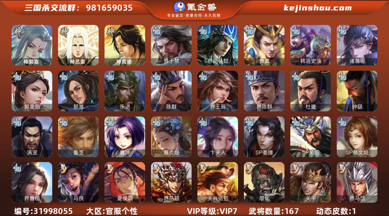 VIP等级: VIP6 官阶: 领军将军 武将数量: 223 动态皮肤数量: 12 神将: 神赵云 魏国武将: 戏志才,曹纯,程昱,界钟会,魏-司马昭,王粲,唐咨-魏,张辽,SP关羽,SP姜维,卞夫人,蔡贞姬,曹昂,曹操,曹冲,曹洪,曹丕,曹仁,王异,鲁芝,界满宠,界曹植,满宠,荀攸,王基,钟繇,郭嘉,荀彧,界郭嘉,崔琰,朱灵,界王异,界郭淮,陈群,袁涣,乐进,郭淮,夏侯惇,曹植,司马朗,界曹操,星周不疑,许褚,界张辽,张郃,钟会,文聘,界夏侯惇,诸葛诞,司马懿,甄姬,徐晃,孙资刘放,韩浩史涣,曹真,典韦,夏侯渊,李典,于禁,邓艾,界司马懿,臧霸,朱灵(国战),成济,司马伷,董昭 蜀国武将: 沙摩柯,谋马超,谋赵云,胡金定,严颜,赵云,张松,彭羕,李丰,界刘备,刘封,糜竺,李遗,谋庞统,黄月英,关羽,吴懿,张飞,魏延,马忠,刘禅,张翼,SP孙尚香,SP徐庶,卧龙诸葛,周仓,界关兴张苞,诸葛亮,界张飞,法正,界简雍,陈到,界马岱,关平,马岱,庞统,诸葛果,马谡,马超,霍峻,廖化,关兴张苞,孟获,秦宓,吴苋,黄忠,刘备,界马超,李严,马良,蒋琬费祎,刘谌,彭羕(国战),蜀-糜芳傅士仁,SP甘夫人,势陈到 吴国武将: 界徐盛,界朱然,潘濬,周泰,吕蒙,诸葛恪,桥公,谋周瑜,孙茹,薛综,蒋钦,顾雍,孙亮,祖茂,濮阳兴,凌操,徐氏,孙尚香,程普,大乔,韩当,陆逊,诸葛瑾,朱然,太史慈,虞翻,界黄盖,孙鲁班,界周瑜,孙权,界孙鲁班,谋小乔,界甘宁,吴国太,甘宁,界大乔,孙坚,孙鲁育,步练师,周瑜,小乔,潘璋马忠,黄盖,孙策,界陆逊,吴-唐咨,张昭张纮,吴-糜芳傅士仁,孙邵 群国武将: 麹义,士燮,许攸,左慈,伏完,华雄,袁术,界庞德,于吉,界公孙瓒,董承,吕布,星徐晃,李儒,公孙瓒,SP赵云,蔡夫人,界刘表,樊稠,SP太史慈,潘凤,界袁术,陈宫,SP马超,谋张角,朱儁,蹋顿,界华佗,贾诩,羊祜,庞德,张宝,董卓,何太后,谋卢植,张角,曹节,袁绍,华佗,刘虞,貂蝉,伏皇后,界吕布,严白虎,高览,公孙渊,颜良文丑,谋高顺,邹氏,贾充,群-司马昭,马腾,纪灵,田丰,星董卓