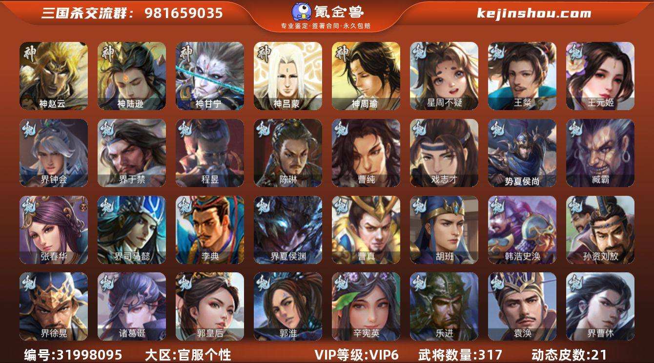 神赵云,神陆逊,神甘宁,星周不疑,王粲,王元姬,界钟会,界于禁,陈琳,曹纯,戏志才,程昱,谋诸葛亮,谋赵云,谋马超,沙摩柯,谯周,花鬘,吴景,界朱然,界徐盛,贺齐,界沮授,左慈,麹义,庞德公,沮授,兀突骨,士燮,神吕蒙,神周瑜,势夏侯尚,SP关羽,SP蔡文姬,乐进,曹昂,诸葛诞,朱灵,文聘,SP姜维,张春华,钟会,曹冲,郭淮,满宠,界王异,界曹操,界司马懿,界夏侯惇,界张辽,界许褚,界郭嘉,李典,曹真,韩浩史涣,陈群,曹叡,曹休,钟繇,司马朗,王基,郭皇后,孙资刘放,辛宪英,界甄姬,吕虔,界徐晃,杜畿,界曹丕,张恭,界曹植,界满宠,界郭淮,华歆,袁涣,崔琰,毛玠,谋徐晃,谋于禁,界曹休,胡班,文钦,界夏侯渊,臧霸,唐咨,SP孙尚香,关银屏,夏侯霸,马良,关兴张苞,廖化,界马岱,关平,简雍,刘封,界法正,界关兴张苞,界刘备,界关羽,界张飞,界赵云,SP徐庶,吴懿,周仓,张松,刘谌,夏侯氏,糜竺,马忠,李严,黄皓,界黄月英,严颜,界伊籍,界庞统,界刘禅,吕凯,张翼,杨仪,邓芝,傅肜,界简雍,费祎,糜夫人,王甫赵累,向宠,彭羕,界张嶷,谋张飞,诸葛果,...
