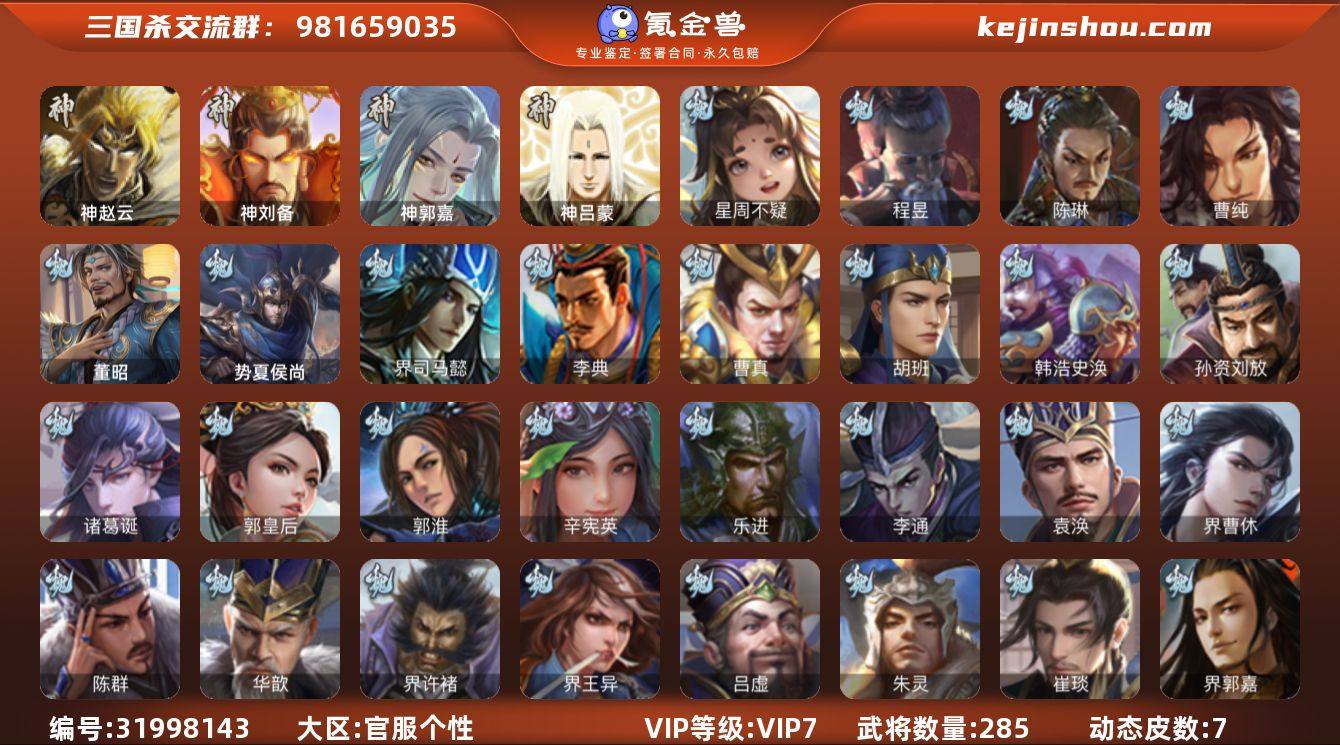 官阶:骠骑将军;VIP等级:VIP7;史诗武将数量:21;动态皮肤数量:7;武将总数:285;史诗宝珠数量:45;将魂数量:5296;神将:3;魏国史诗武将:6;蜀国史诗武将:4;吴国史诗武将:2;群史诗武将:8 神赵云,神刘备,神郭嘉,星周不疑,陈琳,曹纯,程昱,谋赵云,赵襄,张星彩,界黄忠,骆统,界徐盛,裴秀,左慈,界左慈,界李儒,公孙康,谋张角,星董卓,兀突骨,神吕蒙,势夏侯尚,SP关羽,SP蔡文姬,乐进,曹昂,诸葛诞,朱灵,文聘,SP姜维,钟会,曹冲,郭淮,满宠,界王异,界曹操,界司马懿,界夏侯惇,界张辽,界许褚,界郭嘉,李典,曹真,韩浩史涣,陈群,曹叡,钟繇,司马朗,王基,李通,郭皇后,孙资刘放,辛宪英,吕虔,鲁芝,杜畿,张恭,界满宠,华歆,蔡贞姬,袁涣,崔琰,阮慧,谋徐晃,谋于禁,界曹休,胡班,唐咨,董昭,势陈到,SP孙尚香,关银屏,夏侯霸,马良,关兴张苞,廖化,界马岱,关平,简雍,刘封,界法正,界关兴张苞,界刘备,界关羽,界张飞,界马超,SP徐庶,吴懿,周仓,张松,刘谌,夏侯氏,糜竺,李严,黄皓,赵统赵广,界伊籍,界卧龙诸葛,界庞统,张翼,杨仪,邓芝,界简雍,费祎,王甫赵累,界周仓,刘巴,彭羕,谋庞统,界张嶷,谋姜维,谋张飞,吴班,霍峻,诸葛果,界魏延,蒋琬费祎,甘夫人,鲁肃,凌操,大乔小乔,诸葛恪,诸葛瑾,孙鲁育,程普,韩当,潘璋马忠,虞翻,朱然,界甘宁,界吕蒙,界黄盖,界周瑜,界大乔,界陆逊,孙鲁班,朱桓,顾雍,孙休,阚泽,孙登,岑昏,界孙权,潘濬,吕岱,陆抗,界张昭张纮,许贡,卫温诸葛直,界吴国太,界潘璋马忠,孙邵,陈武董袭,蒋钦,谋韩当,谋吕蒙,谋周瑜,界全琮,界朱治,谋小乔,张布,友庞统,伏完,刘协,界袁术,SP赵云,张宝,伏皇后,李儒,华雄,袁术,界华佗,界吕布,公孙瓒,蔡夫人,公孙渊,郭图逢纪,张鲁,蹋顿,严白虎,SP黄月英,曹节,蔡邕,卢植,刘琦,界庞德,界颜良文丑,刘繇,董承,界刘表,星张郃,界公孙瓒,丁原,胡车儿,界伏皇后,谋杨婉,谋刘赪,马日磾,王濬,谋卢植,谋华雄,李傕郭汜,曹操-逐鹿天...
