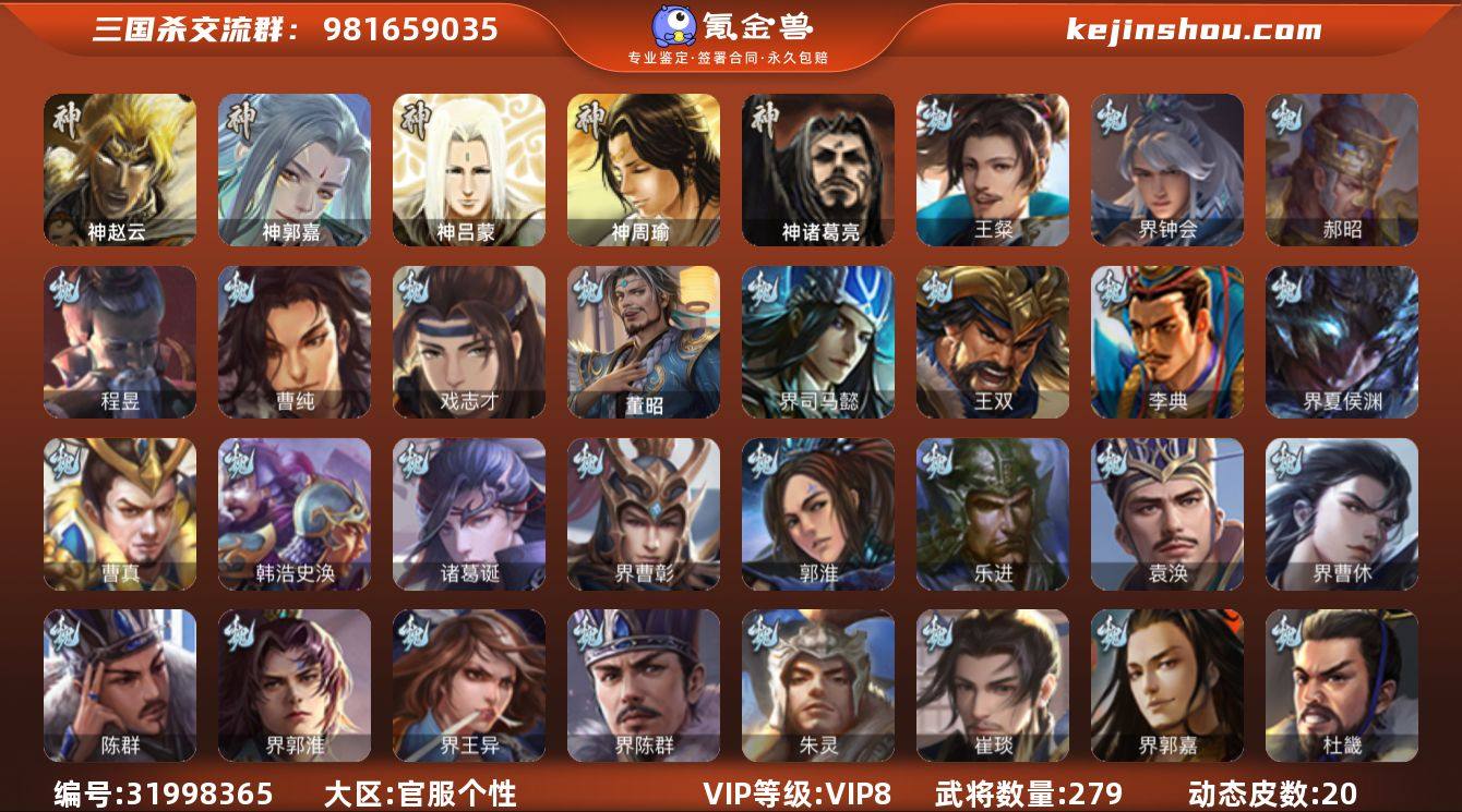 官阶:骠骑将军;VIP等级:VIP8;史诗武将数量:25;动态皮肤数量:20;武将总数:279;史诗宝珠数量:0;将魂数量:4240;神将:3;魏国史诗武将:12;蜀国史诗武将:9;吴国史诗武将:3;群史诗武将:5 神赵云,神郭嘉,神诸葛亮,王粲,界钟会,郝昭,曹纯,戏志才,程昱,关索,马云騄,谋赵云,谋马超,沙摩柯,谯周,界黄忠,花鬘,董允,周处,骆统,界徐盛,沮授,界李儒,公孙康,许攸,兀突骨,神吕蒙,神周瑜,SP关羽,SP蔡文姬,乐进,曹昂,诸葛诞,朱灵,文聘,SP姜维,钟会,曹冲,郭淮,满宠,界王异,界曹操,界司马懿,界夏侯惇,界张辽,界郭嘉,李典,曹真,韩浩史涣,陈群,曹叡,钟繇,司马朗,鲁芝,界荀彧,杜畿,张恭,界曹植,界曹彰,界郭淮,卞夫人,界陈群,蔡贞姬,袁涣,王双,崔琰,谋徐晃,谋于禁,界曹休,牵招,司马伷,界夏侯渊,唐咨,董昭,SP孙尚香,夏侯霸,马良,关兴张苞,廖化,界马岱,关平,刘封,界法正,界关兴张苞,界刘备,界关羽,界马超,SP徐庶,吴懿,周仓,张松,刘谌,糜竺,马忠,孙乾,赵统赵广,严颜,界庞统,陈到,界刘禅,吕凯,张翼,杨仪,界简雍,陈震,糜夫人,界周仓,蒋琬,刘巴,界吴懿,彭羕,谋庞统,界张嶷,谋姜维,谋张飞,诸葛果,糜芳傅士仁,甘夫人,孙茹,凌操,诸葛瑾,孙鲁育,程普,韩当,潘璋马忠,虞翻,朱然,界甘宁,界吕蒙,界黄盖,界周瑜,界大乔,界陆逊,孙鲁班,朱桓,顾雍,孙休,朱治,阚泽,孙登,界孙权,潘濬,孙亮,严畯,吕岱,界孙策,卫温诸葛直,桥公,蒋钦,吕范,界顾雍,界孙鲁班,谋吕蒙,界朱治,谋小乔,伏完,刘协,界袁术,SP赵云,张宝,伏皇后,李儒,界于吉,华雄,袁术,界华佗,界吕布,公孙瓒,蔡夫人,公孙渊,张鲁,严白虎,SP黄月英,董白,蔡邕,界貂蝉,刘琦,界庞德,樊稠,刘繇,界刘表,星张辽,星张郃,界公孙瓒,丁原,界伏皇后,羊祜,谋杨婉,谋刘赪,王濬,谋华雄,谋高顺,阎象,李傕郭汜,神甘宁-万人辟易(动态),神郭嘉-虎年清明(动态),神诸葛亮-观星唤雨,曹操-逐鹿天下(动态),甄姬-明珠耀躯(动态...