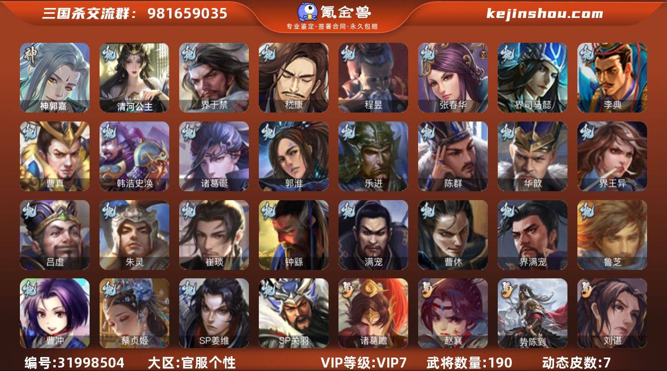 神郭嘉,界于禁,嵇康,清河公主,程昱,诸葛瞻,赵襄,界朱然,卑弥呼,笮融,SP关羽,乐进,诸葛诞,朱灵,文聘,SP姜维,张春华,钟会,曹冲,郭淮,满宠,界王异,界曹操,界司马懿,界夏侯惇,界张辽,李典,曹真,韩浩史涣,陈群,曹休,钟繇,吕虔,鲁芝,界满宠,华歆,蔡贞姬,崔琰,势陈到,SP孙尚香,马良,关兴张苞,廖化,界马岱,关平,简雍,界法正,界关兴张苞,界刘备,界关羽,界马超,SP徐庶,吴懿,周仓,张松,刘谌,夏侯氏,黄皓,界诸葛亮,赵统赵广,界庞统,张翼,界简雍,陈震,糜夫人,谋庞统,界张嶷,诸葛果,蒋琬费祎,甘夫人,鲁肃,凌操,诸葛恪,诸葛瑾,孙鲁育,程普,韩当,潘璋马忠,朱然,界甘宁,界吕蒙,界黄盖,界周瑜,界大乔,界陆逊,孙鲁班,朱桓,顾雍,孙休,全琮,孙登,界孙权,界孙尚香,卫温诸葛直,界潘璋马忠,孙邵,谋周瑜,张布,界小乔,伏完,界袁术,SP赵云,张宝,伏皇后,李儒,华雄,袁术,界华佗,公孙瓒,公孙渊,郭图逢纪,董白,曹节,刘琦,张济,刘繇,界公孙瓒,界伏皇后,孔融,木鹿大王,贾充,张任,神荀彧-匡汉延祚(动态),王元姬-婆娑起舞(动...