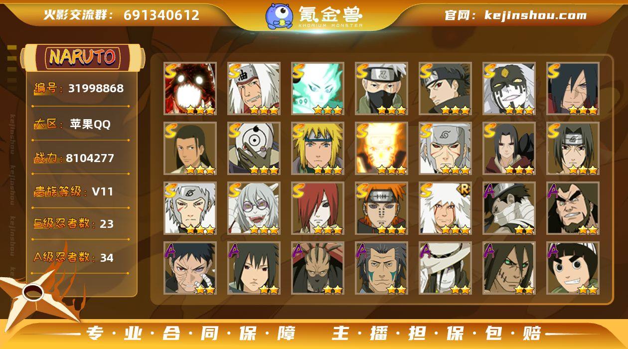 IOS/23S忍/34A忍/战力810W/V11/区服640 【S忍者】 宇智波带土「十尾人柱力」,宇智波佐助「漩涡鸣人」,宇智波止水「须佐能乎」,宇智波斑「五影会谈」 ,大筒木桃式,宇智波斑「秽土转生·解」,千手柱间「木叶创立」,漩涡鸣人「九喇嘛连结」,自来也「舞之豪杰」,旗木卡卡西「须佐能乎」,大筒木舍人「最终章」,自来也「传说中的三忍」,漩涡鸣人「暴怒·第六尾」,宇智波鼬「秽土转生」,药师兜「仙人模式」,宇智波斑「白面具」,千手扉间「秽土转生」,长门「秽土转生」,千手扉间,宇智波鼬「须佐能乎」,佩恩「天道」,波风水门,波风水门「九喇嘛连结」, 【A忍者】 小南「神驹佑将」,机械鸣人「初始形态」,巳月「仙人模式」,迈特凯「青春爆炸」,不缘,日向宁次「忍界大战」,漩涡博人「桃式显现」,宇智波鼬「夏日限定」,旗木卡卡西「幻之真容」,李洛克「忍界大战」,大蛇丸「新春限定」,不动,蝎「绯流琥」,宇智波泉奈,宇智波带土「漂泊浪客」,神农「羁绊」,桃地再不斩「秽土转生」,角都「秽土转生」,长门「青年」,佩恩·六道「漂泊浪客」,三船「青年」,宇智波佐助「须佐能乎」,千代「近松十人卫」,秋道丁次「忍界大战」,宇智波佐助「万花筒写轮眼」,飞段「死司凭血」,飞段,迪达拉,我爱罗「疾风传」,蝎,干柿鬼鲛,宇智波鼬,猿飞阿斯玛,迈特凯, PX_2484254