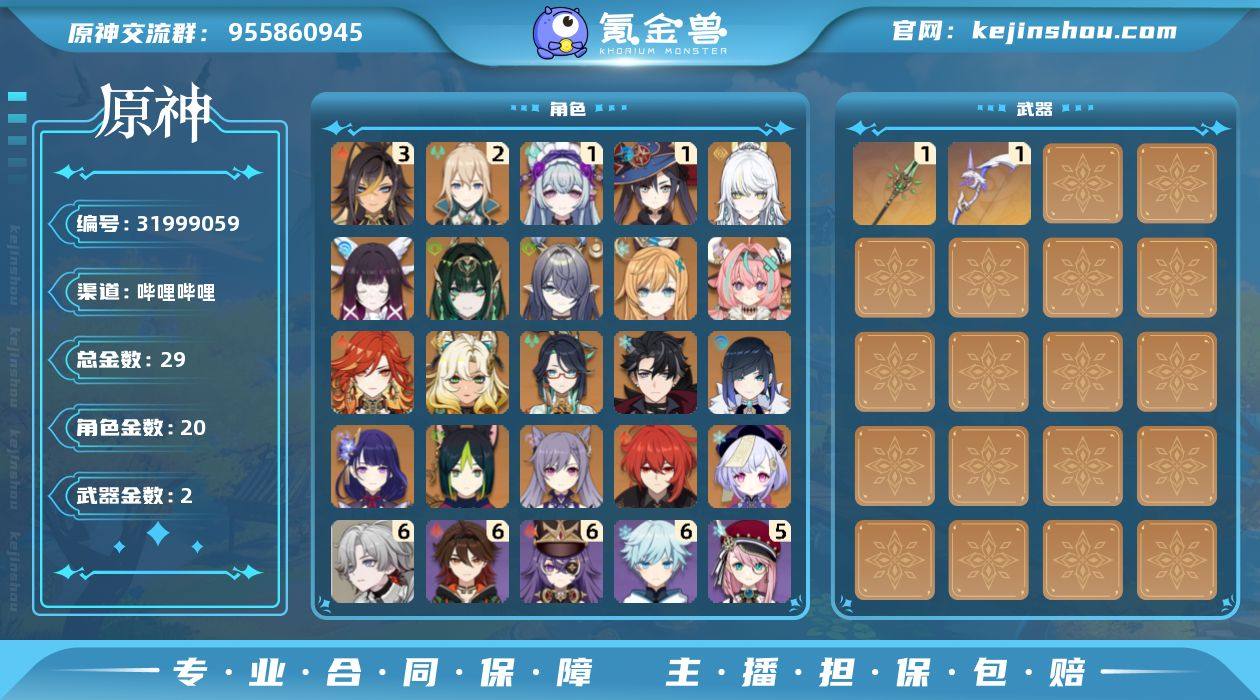 冒险等级:59 总黄数:29 5星角色数:20 5星武器数:2 原石数量:7459 相遇之缘数量:0 纠缠之源数量:1 3命迪希雅,2命琴,1命梦见月瑞希,1命莫娜,0命兹白,0命哥伦比娅,0命奈芙尔,0命菈乌玛,0命爱可菲,0命瓦雷莎,0命玛薇卡,0命希诺宁,0命闲云,0命莱欧斯利,0命夜兰,0命雷电将军,0命提纳里,0命刻晴,0命迪卢克,0命七七 6命叶洛亚,6命嘉明,6命夏沃蕾,6命重云,5命夏洛蒂,5命伊法,5命托马,4命琳妮特,4命行秋,4命珐露珊,4命菲谢尔,4命瑶瑶,3命雅珂达,3命班尼特,3命欧洛伦,3命赛索斯,3命伊安珊,3命芭芭拉,3命多莉,3命五郎,3命早柚,2命爱诺,2命久岐忍,2命迪奥娜,2命凯亚,2命米卡,1命菲米尼,1命塔利雅,1命香菱,1命北斗,1命九条裟罗,1命坎蒂丝,1命柯莱,1命鹿野院平藏,1命砂糖,1命烟绯,0命卡齐娜,0命蓝砚,0命安柏,0命卡维,0命雷泽,0命丽莎,0命莱依拉,0命诺艾尔,0命凝光,0命辛焱,0命云堇 精1和璞鸢,精1阿莫斯之弓 100%侦察骑士,古恩希尔德的传承,星与月之约 卖家说:小手法号,三队月体系,有个7000多原石