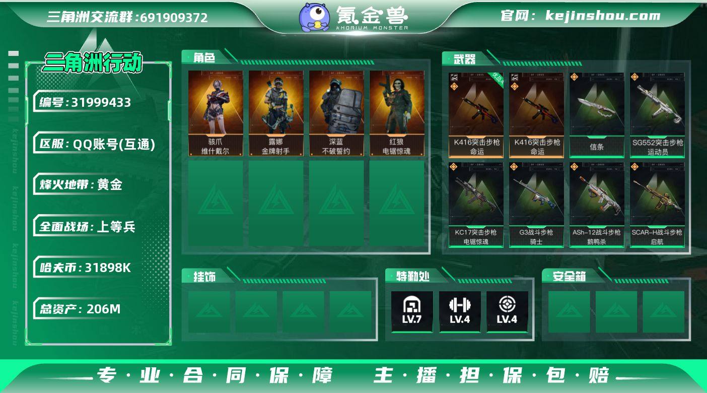 【精品号】C2759-206m总资产-31898k哈伏币-60烽火等级-黄金-31战场等级-上等兵 【干员外观】:骇爪-维什戴尔,深蓝-不破誓约,红狼-电锯惊魂,露娜-金牌射手 【近战皮肤】:近战-信条,近战-黑鹰 【典藏外观】:K416突击步枪-命运 【典藏外观成色】:K416突击步枪-命运(优品A) 【传说外观】:M4A1突击步枪-阿米娅,ASh-12战斗步枪-鹅鸭杀,SG552突击步枪-运动员,SCAR-H战斗步枪-启航,G3战斗步枪-骑士,CAR-15突击步枪-阿米娅,KC17突击步枪-电锯惊魂,QCQ171冲锋枪-鹅鸭杀,M250通用机枪-骑士之心,QJB201轻机枪-鹅鸭杀,M14射手步枪-电锯惊魂,R93狙击步枪-维什戴尔 【史诗外观】:ASh-12战斗步枪-无极限,M7战斗步枪-百步穿杨,G3战斗步枪-流沙送葬,AS Val突击步枪-百步穿杨,K437突击步枪-守护者,MP5冲锋枪-战术竞备,Vector冲锋枪-百步穿杨,SR-3M紧凑突击步枪-战术竞备,MP7冲锋枪-守护者,M250通用机枪-囚徒,Mini-14射手步枪-守护者,M700狙击步枪-百步穿杨,AWM狙击步枪-无极限,AWM狙击步枪-流沙送葬,复合弓-守护者 【稀有外观】:SR-3M紧凑突击步枪-花岗岩,M870霰弹枪-地平线*2,M4A1突击步枪-繁盛,AKM突击步枪-战术演练,AKM突击步枪-肃杀,QBZ95-1突击步枪-公平竞技,ASh-12战斗步枪-繁盛,M7战斗步枪-前沿科技,M7战斗步枪-捣蛋鬼,SCAR-H战斗步枪-荣耀列队,SCAR-H战斗步枪-黄昏,G3战斗步枪-战术演练,G3战斗步枪-主宰*2,MP5冲锋枪-哈夫克卫队,P90冲锋枪-黄昏,Vector冲锋枪-先锋,UZI冲锋枪-亚特兰蒂斯,SMG-45-行动开启,SMG-45冲锋枪-幻影结构,SR-3M紧凑突击步枪-前沿科技,勇士冲锋枪-主宰,勇士冲锋枪-冰天雪地,M1014霰弹枪-幻影结构,S12K霰弹枪-战术演练,QJB201轻机枪-黄昏,QJB201轻机枪-哈夫克卫队,Mini-14射手步枪-荣耀列队,SKS射手步枪-弄臣,SR-25射手步枪-开拓,PSG-1...