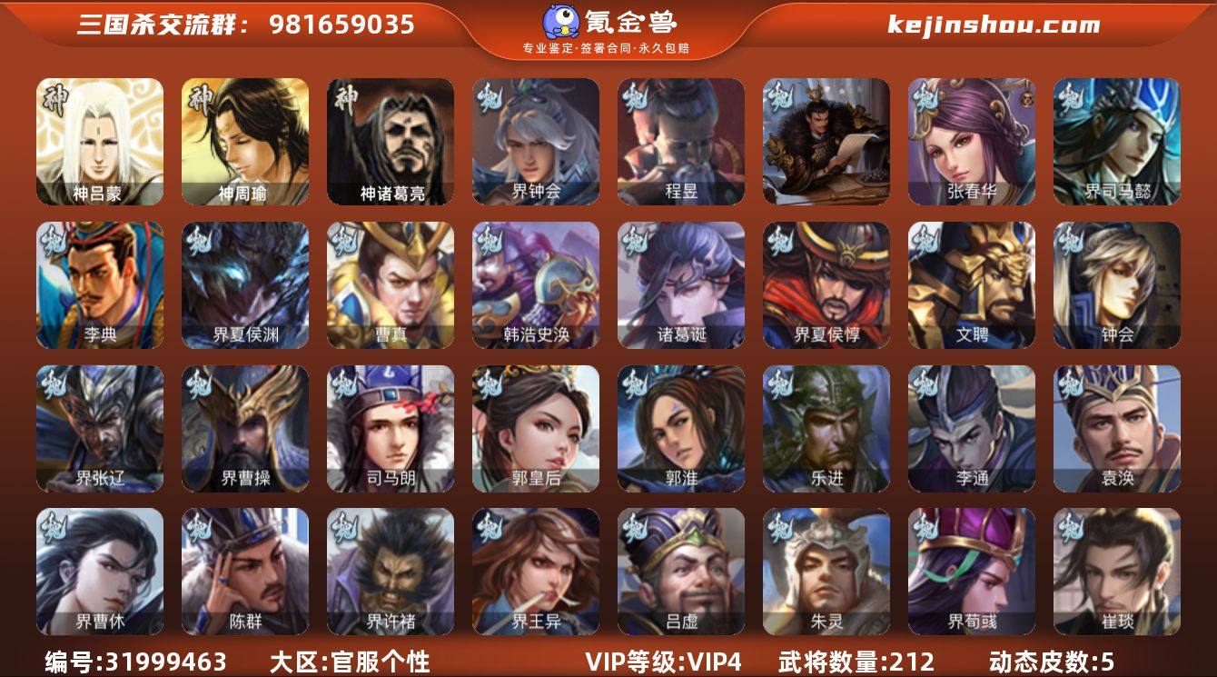 官阶:中军将军;VIP等级:VIP4;史诗武将数量:7;动态皮肤数量:5;武将总数:212;史诗宝珠数量:0;将魂数量:882;神将:1;魏国史诗武将:0;蜀国史诗武将:3;吴国史诗武将:1;群史诗武将:1 神诸葛亮,界钟会,程昱,谋马超,沙摩柯,谯周,孙寒华,麹义,神吕蒙,神周瑜,SP关羽,SP曹仁,乐进,曹昂,诸葛诞,朱灵,文聘,SP姜维,张春华,钟会,曹冲,郭淮,界王异,界曹操,界司马懿,界夏侯惇,界张辽,界许褚,李典,曹真,韩浩史涣,陈群,钟繇,司马朗,李通,郭皇后,吕虔,界荀彧,杜畿,界曹植,卞夫人,袁涣,崔琰,阮慧,谋徐晃,谋于禁,界曹休,界夏侯渊,势陈到,SP孙尚香,关银屏,马良,关兴张苞,廖化,界马岱,关平,简雍,刘封,界关兴张苞,界刘备,界关羽,界赵云,界马超,SP徐庶,吴懿,周仓,张松,夏侯氏,界祝融,张翼,杨仪,邓芝,傅肜,界简雍,界周仓,刘巴,谋孟获,谋张飞,吴班,诸葛果,鲁肃,诸葛瑾,孙鲁育,程普,韩当,潘璋马忠,虞翻,界甘宁,界黄盖,界周瑜,界大乔,界陆逊,孙鲁班,朱桓,顾雍,孙休,朱治,界孙权,界孙尚香,吕岱,吕范,谋吕蒙,界全琮,张布,孟达,伏完,界袁术,SP赵云,张宝,伏皇后,李儒,界张角,华雄,袁术,界华佗,界吕布,公孙瓒,蔡夫人,公孙渊,严白虎,SP黄月英,刘虞,卢植,董承,界刘表,星张辽,星徐晃,星张郃,界公孙瓒,丁原,胡车儿,孔融,谋刘赪,马日磾,谋卢植,谋华雄,阎象,张任,仲帝袁术,卧龙诸葛-火烧博望(动态),孙权-兔年中秋(动态),大乔-鼠年春分(动态),周处-义除三害(动态),曹节-龙年中秋(动态),麹义-扬刀立威(动态)