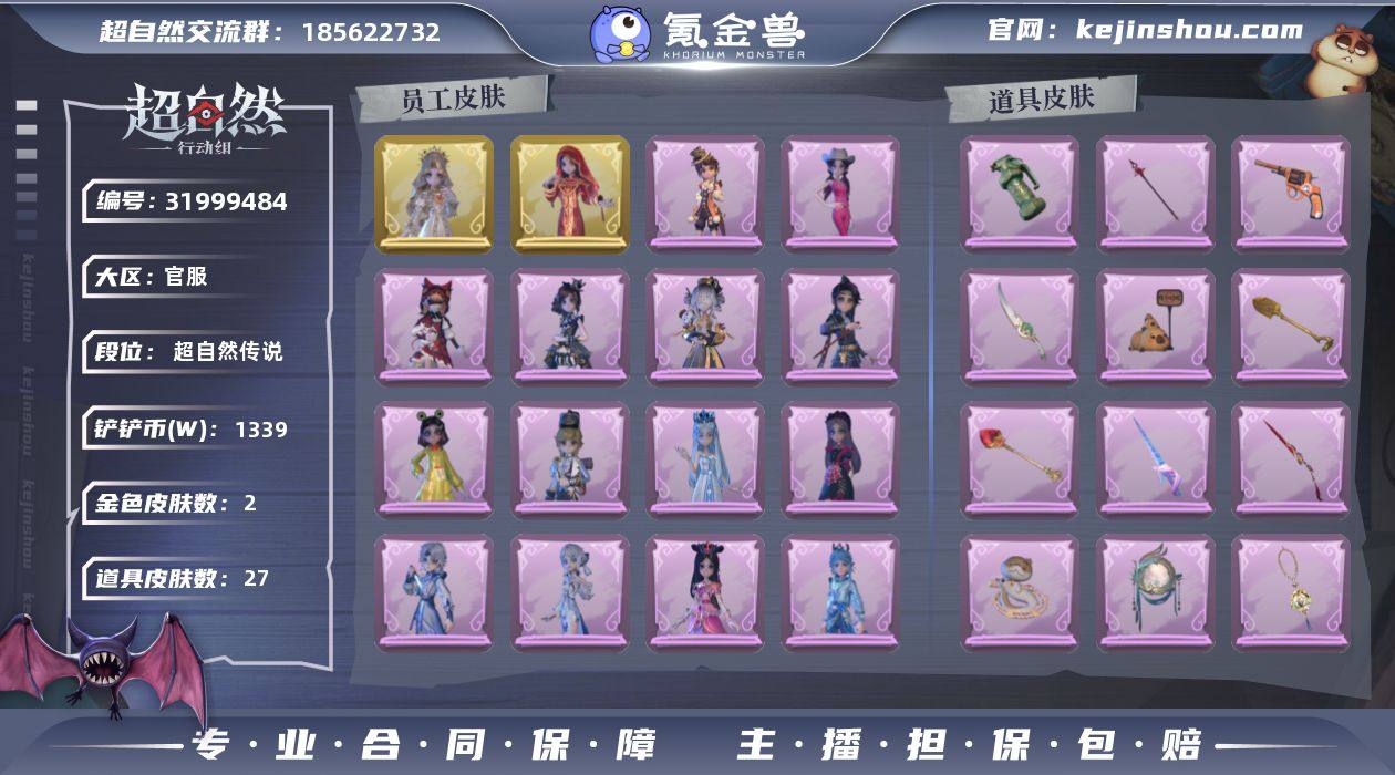 金皮2;紫皮16;道具皮27;皮肤:巫铃儿-镜花辞,薇薇安-圣光之谕,艾伦-水王子,巫铃儿-素影瑶光,小黄-罗丽,莉莉-除妖小师妹,阿念-王子与骑士,小黄-呱呱雨衣,阿念-庆宴绮愿,小黄-异色序曲,逍遥-绣春逍影,零-青云逸歌,莉莉-情公主,莉莉-莓果陷阱,爱丽丝-耀眼的你,爱丽丝-冰公主,薇薇安-白光莹,爱丽丝-丝缕哀歌;道具:刺刀-碧络琅环,摸金符-祝祷词,腰包-月下莲台,专业手电-云端梦想计划,桃木剑-凤鸣九天,长鞭-小狗蛇点点鞭,音响-happy猫,喷气背包-乘风溯雪,闪光弹-金戈玄铜,铲子-圣心之泪,传送按钮-昆仑镜,黄牛能量饮料-珍珠芭乐莓莓,音响-鸣沙鼓,长枪-罪棘,铲子-龙鳞,短管猎枪-赞萌露比水枪,夜视仪-金丝眼镜,铲子-卡皮巴拉小黄豚铲,短管猎枪-星光的裁决,摸金符-花落精绝,葫芦-伏妖塔,黄牛能量饮料-青玉抱丹,急救包-蔷薇物语,桃木剑-最后的独角兽,转轮手枪-新星时代,摸金符-紫霄,额外的背包-飞花令;饰品:头饰-火爆了头套,头饰-滑稽头套,头饰-烛光纪念,头饰-惊魂南瓜头套,头饰-小财神豚豚头套,头饰-小狗蛇点点头套,头饰-蒜了八,头饰-樱桃奶油布丁,头饰-烈焰红唇头套,头饰-腊肠扭扭,头饰-太空鲨头套,头饰-面具马头套,头饰-雪墩墩头套,头饰-鱼头怪头套,头饰-炙热烧烤,头饰-哈士奇头套,头饰-大葱明头套,头饰-嘻嘻头套,头饰-呆滞头套,头饰-卑微头套,头饰-萨卡班甲鱼头套,头饰-像素朋克墨镜,头饰-后室幸存者头套,挂饰-九色祥鹿,挂饰-天使消失的年代,挂饰-钗头凤,挂饰-未竟乐园,背饰-云梦之星,背饰-牛啤背包,背饰-梵音莲华,背饰-绒团小狐狸,背饰-蝶恋花;主页装扮:主页装扮-樱落金笺,主页装扮-虚镜回廊;动作:动作-九万字舞,动作-鸳鸯戏,动作-心跳摇,动作-知世摇,动作-luvaboy,动作-DL摇,动作-小雨摇,动作-鹏友摇,动作-舞台中心,动作-要糖,动作-抬手,动作-KT猫摇,动作-带你逃跑吧,动作-举牌,动作-律动迪斯科;工牌背景:...