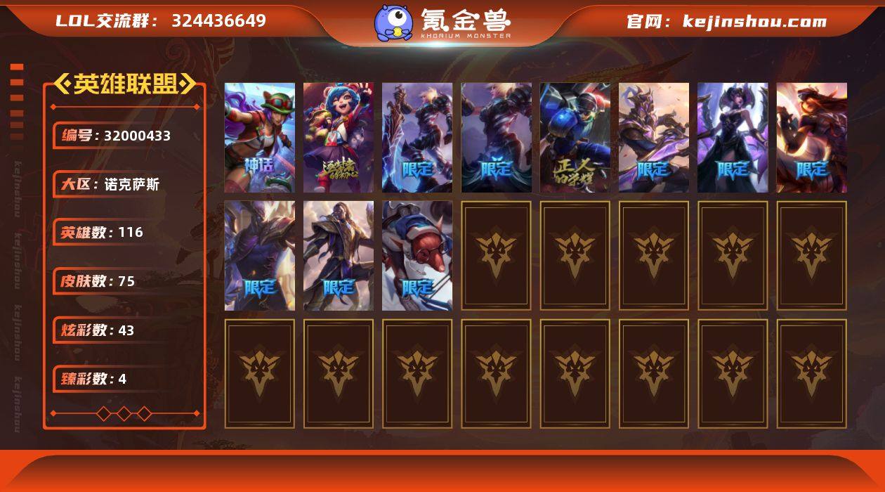 【LDC2688】116英雄/75皮肤/2神话/12限定/4臻彩/43炫彩/7传说/12史诗/钻石/10周年 安妮/十五周年纪念 希维尔/觅心游侠卢锡安/冰霜之刃 艾瑞莉娅 炫金/冠军掠夺者 卡兹克 凯旋圣装/玉剑传说 苍鸾 丁香/黑夜使者 嘉文四世 白夜/冠军之刃 锐雯/冠军之刃 锐雯 2016/S4 SSW 图奇/暗裔英雄 盖伦/胜利女神 莫甘娜/胜利女神 希维尔/胜利之剑 亚托克斯/胜利枪神 卢锡安/胜利剑圣 易/鬼影森森 茂凯/防暴天使 凯尔/邪鸦魅影 乐芙兰/驯龙炮手 崔丝塔娜/双重冰晶 艾尼维亚/电玩女神 娑娜/冰川巨兽 墨菲特/地狱行者 孙悟空/黑夜使者 亚索/腥红之月 崔斯特/古墓丽影 凯特琳/至高之拳 李青/苍穹之光 薇恩/铁血猎手 奈德丽/大夏武士 潘森/死亡领主 莫德凯撒/奥术光辉 拉克丝/黑帮教父 格雷福斯/奥术大师 吉格斯/暗黑女武神 黛安娜/腥红之月 黛安娜/龙族卫士加里奥/玉剑传说无极/腥红之月易/咖啡甜心希维尔/脏兮兮努努和威朗普/极地女神艾希/玉剑传说苍鸾/惊天魔盗伊芙琳/莲花之令艾瑞莉娅/海牛骑手库奇/永恒之森维迦/宇航员茂凯/黑色玫瑰假面舞会伊莉丝/太空律动狗头内瑟斯/狂热球迷古拉加斯/地下都市梦魇阿卡丽/灵魂莲华锐雯/光明哨兵锐雯/怒之火炮格雷福斯/苔原猎手菲兹/怒熊沃利贝尔/夜魔水晶韦鲁斯/禁魔石巨像诺提勒斯/太空律动节奏幻师璐璐/德莱德莱德莱文/破败军团德莱文/热血班长德莱厄斯/西部魔影德莱厄斯/战斗学院杰斯/女帝黛安娜/魔女卡蜜尔/猫狗大战千珏/双城之战金克丝/福牛守护者佛耶戈/德玛西亚警官卢锡安/女帝奇亚娜/狗头猫咪悠米/西部魔影锤石/巴德吟游诗人/源计划逆流塞拉斯/灵能特工派克/黎明使者薇古丝