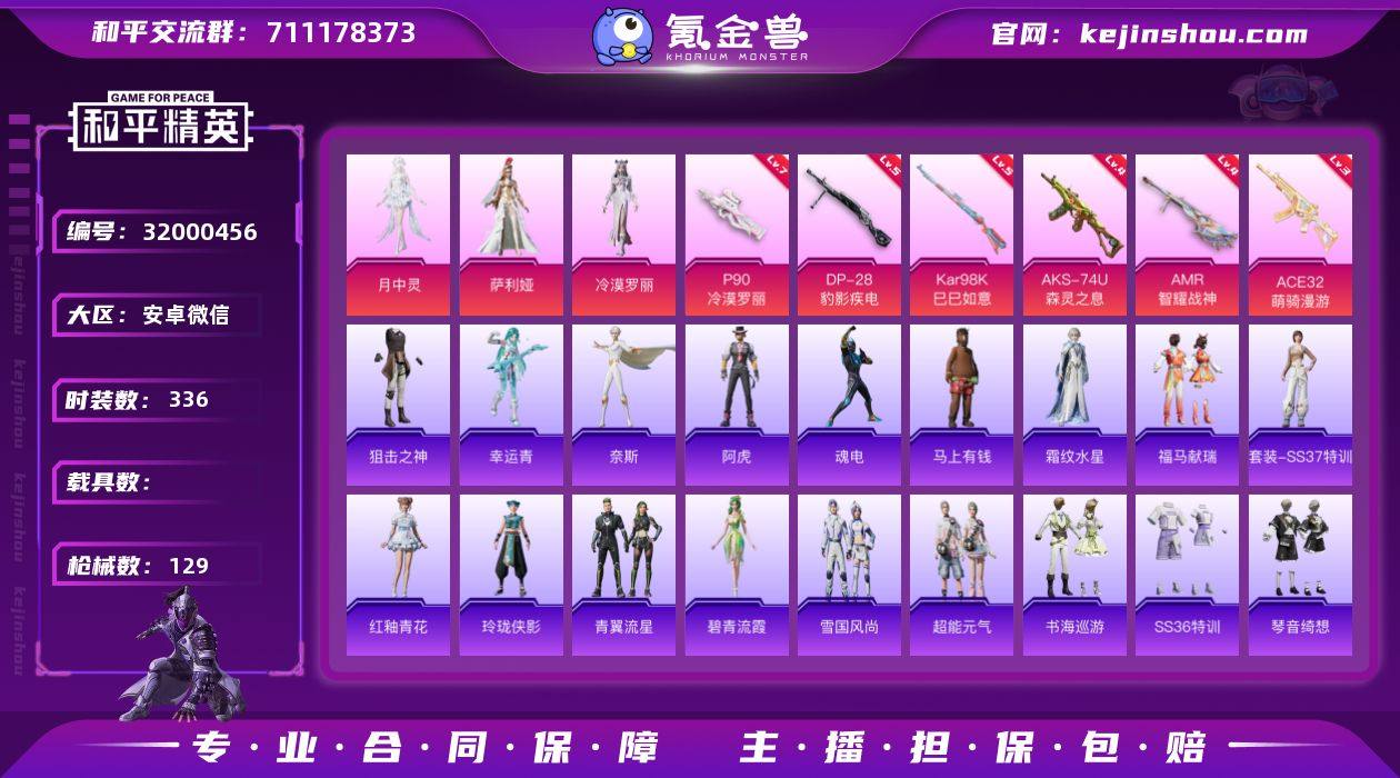 实名:不可二次实名 是否支持人脸包赔:不支持 粉装数量:3 特效枪数量:6 时装数:336 枪械数:129 月中灵,冷漠罗丽,萨利娅 七级P90-冷漠罗丽,五级DP-28-豹影疾电,五级Kar98K-巳巳如意,四级AKS-74U-森灵之息,四级AMR-智耀战神,三级ACE32-萌骑漫游 狙击之神,阿虎,魂电,马上有钱,奈斯,幸运青,福马献瑞,霜纹水星,红釉青花,SS37特训,雨过天青,玲珑侠影,青翼流星,碧青流霞,雪国风尚,超能元气,画境星梦,琴音绮想,书海巡游,SS36特训,炫彩糖果,绯色魅影,萌鸡速递,紫俏灵猫,风迹短诗,秘语星愿,SS35特训,午间小调,元气之梦,漫游都市,喜羊羊,薄荷星砂,狂鲨锋刃,SS34特训套装,游乐,滨海厨神,白糯汤圆,白熊同盟,彩虹兔,潮流炫酷,超能勇士,春日漫步,顶瓜瓜,大橘大利,粉恋花,瑰梦爱神,海岛探路者,鹤鸣,幻世保卫者,黄色运动,绛羽幽主,狂战萌兔,蓝冰羽,浪漫天命,蓝色运动,蓝调潮影,恋语绒绒,魅力单车,霓虹热舞,绮丽涂鸦,清新柠檬,云朵鹅,深蓝色名流,沙漠毒蛇,SS31特训套装,SS32特训套装,SS33特训套装,巳巳如意,石蕴玉辉,特训学院,特战装甲,小丑鱼,雪绒豹,雪鹰学院,鹰眼刺客,鱼渊荷华,燕燕于飞,异域银装,紫幽梦 炫彩糖果飞行器,镜花水月降落伞,炫彩糖果降落伞,异瞳寒姬降落伞,幻彩电音降落伞,星穹咏叹调降落伞,月影灵韵降落伞,仲夏莫吉托降落伞 卖家说:连体王者便宜出