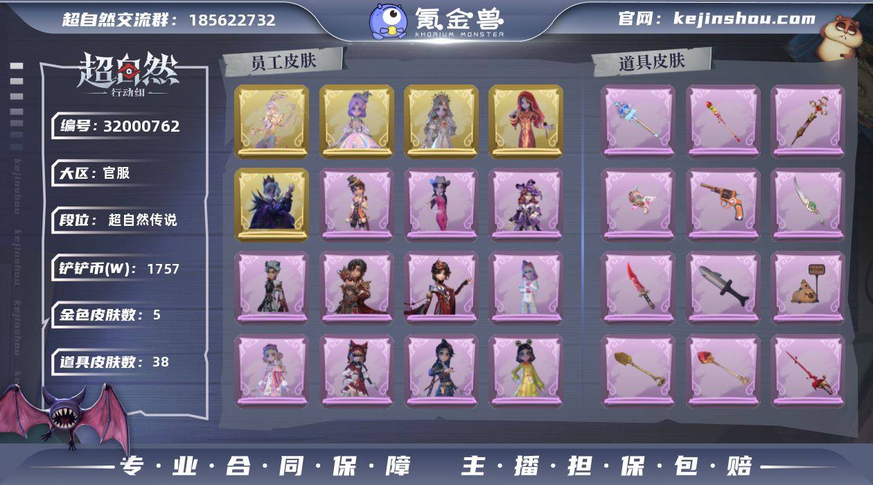 金色皮肤数量: 5 紫色皮肤数量: 15 道具皮肤数量: 38 段位: 超自然传说 员工: 逍遥,薇薇安,巫铃儿,莉莉,阿念,艾伦,小黄,零,爱丽丝,爱德华,兰,小满,临云 外观: 遗失的童话,圣光之谕,镜花辞,王子与骑士,丝缕哀歌,黑月挽歌,白光莹,嘻嘻头套,烈焰红唇头套,呆滞头套,炙热烧烤,卑微头套,哈士奇头套,滑稽头套,鳄霸天头套,鱼头怪头套,面具马头套,萨卡班甲鱼头套,小狗蛇点点头套,云梦之星,天使的呼唤,蝶恋花,小鲨包包,未竟乐园,天使消失的年代,钗头凤,呱呱雨衣,绣春逍影,梵音莲华,九色祥鹿,火爆了头套,莲华渡,精致露比头套,惊魂南瓜,莓果陷阱,潮汐小海兔,糖果守卫,甜梦派对,绒绒对决,樱桃奶油布丁,仙锋小姐,搬开山,千夜星谕,渡鸦公爵,雪墩墩头套,太空鲨头套,尘封旧事,子夜证词,黎明猎手,耀眼的你,庆宴绮愿,炽天使的余烬,烛光纪念,牛啤背包