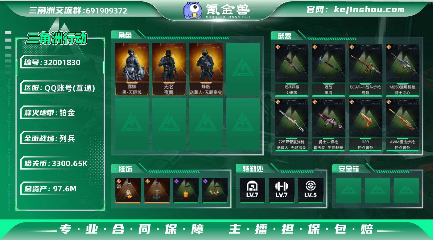 实名:可二次实名 总资产:97.6M 哈夫币:3300.65K 烽火地带段位:铂金 烽火地带等级:60 全面战场段位:列兵 全面战场等级:16 7级仓库,7级训练中心,5级靶场,1级潜水中心,0级收藏室 战术部门等级:3 战斗部门等级:2 医疗部门等级:3 研发部门等级:2 后勤部门等级:2 曼德尔砖-气象感应:0 曼德尔砖-命运王牌:0 曼德尔砖-电玩高手:0 曼德尔砖-美杜莎:0