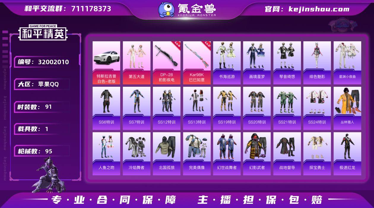 【特价出售/店主推荐】苹果 手Q-1粉装-3特效枪-1载具-1粉色飞行器-3w热力值-4王牌印记-91套装-95枪皮 【粉色套装】:粉装-第五大道 【粉色枪皮等级】:AKS-74U-森灵之息(五级),Kar98K-巳巳如意(二级),DP-28-豹影疾电(四级) 【粉色载具】:特斯拉Model X(珍珠白) 【粉色枪皮】:AKS-74U-森灵之息,Kar98K-巳巳如意,DP-28-豹影疾电 【粉色飞行器】:炫彩糖果飞行器 【粉色降落伞】:华贵君王降落伞,第五大道降落伞,异瞳寒姬降落伞,炫彩糖果降落伞 【稀有套装】:套装-炫彩糖果,套装-星渊小夜曲,角色-绯色魅影,套装-书海巡游,套装-画境星梦,套装-琴音绮想 【稀有枪皮】:AKM-破晓战魂,AKM-霓虹街区,M16A4-幻世战舞者,SCAR-L-玉兔迎春,SCAR-L-红色方程式,M416-红色方程式,M416-蓝色火焰,GROZA-彩虹符号,GROZA-黑色刀锋,AUG-魔法学院,M762-天降萌叽,M762-深海曼妙,Mk47-洛神天依,AC-VAL-天降萌叽,蜜獾-垂柳戏鸭,蜜獾-娇憨猪猪,ACE32-画境星梦,UZI-众神之王,UZI-啾咪啾咪,UZI-娇憨猪猪,UZI-影袭,UMP45-生命誓言,Vector-黑色刀锋,汤姆逊-天降萌叽,MP5K-众神之王,MP5K-画境星梦,P90-巳巳如意,Kar98K-洛神天依,Kar98K-炫彩节奏,M24-炫彩节奏,AWM-垂柳戏鸭,AWM-暮色玫影,SKS-夜灯,SKS-炫彩节奏,VSS-黑色刀锋,Mini14-耀粉歌者,SLR-众神之王,SLR-娇憨猪猪,M1加兰德-画境星梦,S686-雪月幻音,S1897-神秘黑猫,S12K-娇憨猪猪,S12K-幻世战舞者,DBS-创世·救赎,AA12-G-画境星梦,DP-28-彩虹符号,MG3-幻世战舞者,平底锅-画境星梦 【其他套装】:套装-SS6特训,套装-SS7特训,套装-SS12特训,套装-SS13特训,套装-SS19特训,套装-SS20特训,套装-SS21特训,套装-SS24特训,套装-丛林猎人,套装-人鱼之吻,套装-冷焰舞者,套装-北国孤狼,套装-完美偶像,套装-幻世战舞者,...
