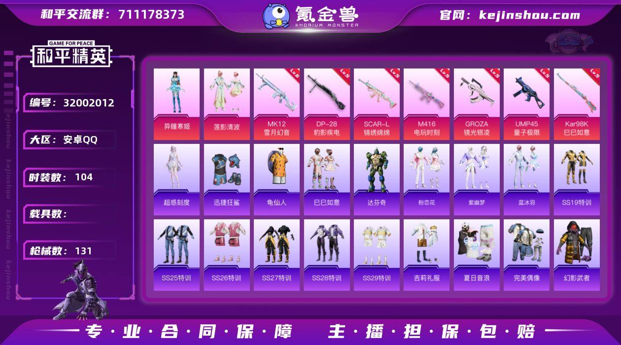 【特价出售/安卓 手Q-2粉装-7特效枪-0载具-1粉色飞行器-39390热力值-11王牌印记-104套装-131枪皮【热门品类】:套装-龟仙人【粉色套装】:粉装-莲影清波,角色-异瞳寒姬【粉色枪皮等级】:SCAR-L-锦绣绵绵(五级),M416-电玩时刻(五级),GROZA-镜光银凌(五级),UMP45-量子极限(五级),Kar98K-巳巳如意(五级),MK12-雪月幻音(六级),DP-28-豹影疾电(五级)【粉色枪皮】:SCAR-L-锦绣绵绵,M416-电玩时刻,GROZA-镜光银凌,UMP45-量子极限,Kar98K-巳巳如意,MK12-雪月幻音,DP-28-豹影疾电