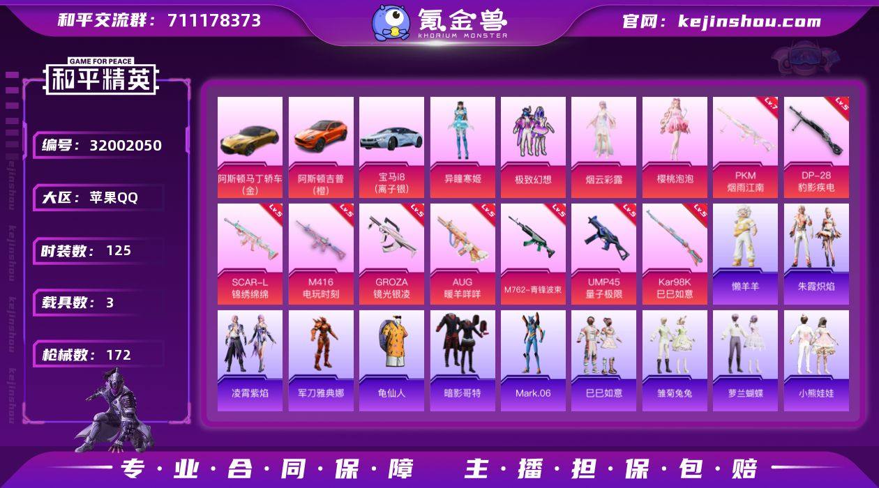 苹果 手Q-4粉装-9特效枪-3载具-5粉色飞行器-58629热力值-7王牌印记-125套装-172枪皮 无二次介意勿拍!【热门品类】:角色-军刀雅典娜,套装-龟仙人,套装-暗影哥特,角色-Mark.06 【粉色载具】:阿斯顿马丁DBS(金),阿斯顿马丁DBX(橙),宝马i8(离子银) 【粉色套装】:粉装-极致幻想,角色-烟云彩露,角色-樱桃泡泡,角色-异瞳寒姬 【粉色枪皮等级】:SCAR-L-锦绣绵绵(五级),M416-电玩时刻(五级),GROZA-镜光银凌(五级),AUG-暖羊咩咩(五级),M762-青锋波束(五级),UMP45-量子极限(五级),Kar98K-巳巳如意(五级),DP-28-豹影疾电(五级),PKM-江南烟雨(七级) 【粉色枪皮】:SCAR-L-锦绣绵绵,M416-电玩时刻,GROZA-镜光银凌,AUG-暖羊咩咩,M762-青锋波束,UMP45-量子极限,Kar98K-巳巳如意,DP-28-豹影疾电,PKM-江南烟雨 【粉色飞行器】:心之恋语飞行翼,齐天大圣飞行器,天之羽翼飞行器,英伦信使飞行器,月下星之子飞行器 【粉色降落伞】:环太平洋降落伞,歌者泠鸢降落伞,萌物绒绒降落伞,蜜语绒猫降落伞,江南烟雨降落伞,精灵梦叶罗丽降落伞,忍者神龟降落伞,临安公主降落伞,智耀战神降落伞,异瞳寒姬降落伞 【稀有套装】:套装-龟仙人,套装-巳巳如意,套装-雏菊兔兔,套装-萝兰蝴蝶,套装-小熊娃娃,套装-糖糖葫芦,套装-青团波波,套装-棉花软糖,角色-许七安,角色-怀庆长公主,套装-燕燕于飞,套装-鱼渊荷华,套装-紫幽梦,套装-蓝冰羽,角色-猎影月神,套装-星影赞美诗,套装-朱霞炽焰,套装-凌霄紫焰,玩偶服-懒羊羊 【稀有枪皮】:AKM-夜灯,AKM-彩虹符号,AKM-江南烟雨,AKM-环太平洋,AKM-生命誓言,AKM-破晓战魂,AKM-虎虎生威,AKM-龙的传人,M16A4-红色方程式,M16A4-蓝色火焰,M16A4-千金淑猫,SCAR-L-炫彩节奏,SCAR-L-玉兔迎春,SCAR-L-红色方程式,M416-红色方程式,M416-蓝色火...