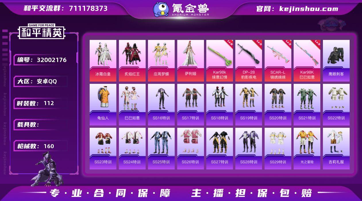 安卓 手Q-4粉装-4特效枪-0载具-1粉色飞行器-41772热力值-11王牌印记-112套装-160枪皮 【热门品类】:套装-龟仙人 【粉色套装】:粉装-冰霜白皇,粉装-炙焰红王,粉装-庄周梦蝶,角色-萨利娅 【粉色枪皮等级】:SCAR-L-锦绣绵绵(五级),Kar98K-绿意幻情(六级),Kar98K-巳巳如意(五级),DP-28-豹影疾电(五级) 【粉色枪皮】:SCAR-L-锦绣绵绵,Kar98K-绿意幻情,Kar98K-巳巳如意,DP-28-豹影疾电 【粉色飞行器】:绝色倾城飞行器 【粉色降落伞】:恐龙拽拽降落伞,仲夏莫吉托降落伞,炫光之旅降落伞,蜜语绒猫降落伞,雪月幻音降落伞 【稀有套装】:套装-龟仙人,套装-巳巳如意 【稀有枪皮】:AKM-奇异狩猎者,AKM-彩虹符号,AKM-影袭,AKM-灼热熔岩,AKM-生命誓言,AKM-破晓战魂,AKM-萌趣颜团子,AKM-虎虎生威,AKM-霓虹街区,AKM-龙的传人,M16A4-幻世战舞者,M16A4-红色方程式,M16A4-蓝色火焰,SCAR-L-炫彩节奏,SCAR-L-玉兔迎春,SCAR-L-红色方程式,SCAR-L-黄金龙骨,SCAR-L-龙宫之主,M416-糯团青竹,M416-红色方程式,M416-绯红前夜,M416-蓝色火焰,GROZA-异彩先驱,GROZA-彩虹符号,GROZA-影袭,GROZA-恐龙拽拽,GROZA-治愈之星,GROZA-田园牧歌,AUG-天降萌叽,AUG-耀粉歌者,AUG-青春冒险家,QBZ-未来歌姬,QBZ-飞驰魅影,M762-天降萌叽,M762-烈焰拳霸,M762-瑞龙福将,Mk47-妙红点点,Mk47-炫光之旅,AC-VAL-天降萌叽,AC-VAL-魅影蝠王,蜜獾-垂柳戏鸭,蜜獾-天降萌叽,蜜獾-娇憨猪猪,UZI-天降萌叽,UZI-娇憨猪猪,UZI-影袭,UZI-炫彩节奏,UZI-红色方程式,UMP45-炫光之旅,UMP45-生命誓言,UMP45-蓝色火焰,UMP45-诡娃娃,UMP45-绒宝小鹅,Vector-彩虹符号,Vector-生命誓言,Vector-田园牧歌,汤姆逊-天降萌叽,汤姆逊-庄周梦蝶,汤姆逊-异彩先驱,汤姆逊-炫彩节奏,汤姆逊-耀粉歌者,MP5K-异彩先...