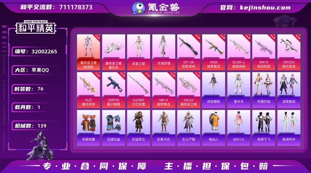 苹果 手Q-5粉装-7特效枪-2载具-2粉色飞行器-43530热力值-5王牌印记-81套装-126枪皮 【热门品类】:粉装-梦幻火箭,套装-龟仙人 【粉色套装】:粉装-梦幻火箭,粉装-绚金战神,角色-圣堂之誓,角色-电磁星,角色-智耀战神 【粉色枪皮等级】:SCAR-L-锦绣绵绵(五级),M416-心之恋语(七级),M416-灵猫魔法师(一级),Kar98K-巳巳如意(五级),AMR-智耀战神(三级),DP-28-圣堂之誓(一级),DP-28-豹影疾电(三级) 【粉色载具】:僚机-冰龙团团,黑曜夜骑,冰绡玉鳞 【粉色枪皮】:SCAR-L-锦绣绵绵,M416-心之恋语,M416-灵猫魔法师,Kar98K-巳巳如意,AMR-智耀战神,DP-28-圣堂之誓,DP-28-豹影疾电 【粉色飞行器】:灵猫魔法师飞行器,灵珠游龙飞行器 【粉色降落伞】:梦幻火箭降落伞,萌酷奶龙降落伞,圣堂之誓降落伞,智耀战神降落伞,灵猫魔法师降落伞,魔童闹海 敖丙降落伞 【稀有套装】:套装-龟仙人,套装-雏菊兔兔,套装-萝兰蝴蝶,套装-小熊娃娃,套装-糖糖葫芦,套装-青团波波,套装-棉花软糖,套装-燕燕于飞,套装-鱼渊荷华,套装-粉恋花,套装-紫幽梦,套装-蓝冰羽,角色-猎影月神,角色-瑰梦爱神,套装-彩虹兔,套装-云朵鹅,套装-雪绒豹,套装-朱霞炽焰,套装-凌霄紫焰,套装-擎苍青焰,套装-画境星梦,套装-琴音绮想 【稀有枪皮】:AKM-彩虹符号,AKM-灵猫魔法师,SCAR-L-炫彩节奏,SCAR-L-红色方程式,M416-糯团青竹,M416-红色方程式,GROZA-异彩先驱,AUG-甜蜜菠萝,AUG-耀粉歌者,AUG-金蛇镇世,M762-瑞龙福将,M762-云朵鹅,AC-VAL-天降萌叽,AC-VAL-快闪甜心,蜜獾-天降萌叽,ACE32-画境星梦,ARX-凌霄紫焰,UZI-啾咪啾咪,UZI-天降萌叽,UMP45-蓝色火焰,Vector-焰鹰斗篷,汤姆逊-异彩先驱,汤姆逊-炫彩节奏,汤姆逊-灵猫魔法师,汤姆逊-智耀战神,MP5K-异彩先驱,MP5K-画境星梦,JS9-凌霄紫焰,P90...