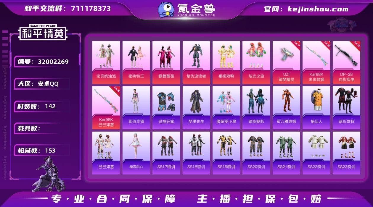 可二次【特价出售/店主推荐】安卓 手Q-6粉装-4特效枪-0载具-2粉色飞行器-49522热力值-5王牌印记-142套装-153枪皮 【热门品类】:角色-军刀雅典娜,套装-龟仙人,套装-暗影哥特 【粉色套装】:粉装-宝贝奶油派,粉装-蜜桃特工,粉装-蝶舞蔷薇,角色-复仇流浪者,粉装-垂柳戏鸭,粉装-炫光之旅 【粉色枪皮等级】:UZI-筑梦精灵(七级),Kar98K-未来歌姬(六级),Kar98K-巳巳如意(五级),DP-28-豹影疾电(五级) 【粉色枪皮】:UZI-筑梦精灵,Kar98K-未来歌姬,Kar98K-巳巳如意,DP-28-豹影疾电 【粉色飞行器】:霓虹漫游飞行器 【粉色降落伞】:甜心宝贝降落伞,星之彼岸降落伞,枪炮玫瑰降落伞,机甲封神降落伞,海渊国主降落伞,甜心娃娃降落伞,碧影闪光降落伞,垂柳戏鸭降落伞,猪猪侠降落伞,炫彩糖果降落伞 【稀有套装】:套装-龟仙人,套装-巳巳如意,套装-炫彩糖果,角色-糖霜甜心,角色-紫俏灵猫 【稀有枪皮】:AKM-彩虹符号,AKM-星兔领航员,AKM-春暖花开,AKM-灼热熔岩,AKM-破晓战魂,AKM-筑梦精灵,AKM-萌趣颜团子,AKM-虎虎生威,AKM-霓虹街区,AKM-龙的传人,M16A4-幻世战舞者,M16A4-甜心亚梦,SCAR-L-炫彩节奏,SCAR-L-玉兔迎春,SCAR-L-碧影闪光,SCAR-L-红色方程式,M416-夜灯,M416-糯团青竹,M416-绯红前夜,M416-蓝色火焰,GROZA-异彩先驱,GROZA-影袭,GROZA-田园牧歌,GROZA-紫翼圣骑,GROZA-蓝莓炮弹,AUG-天降萌叽,AUG-耀粉歌者,QBZ-飞驰魅影,M762-天降萌叽,M762-瑞龙福将,M762-甜心宝贝,M762-绯红前夜,Mk47-妙红点点,AC-VAL-天降萌叽,AC-VAL-甜心亚梦,蜜獾-垂柳戏鸭,蜜獾-天降萌叽,蜜獾-娇憨猪猪,UZI-娇憨猪猪,UZI-炫彩节奏,UZI-月影灵韵,UMP45-蓝色火焰,Vector-枪炮玫瑰,Vector-田园牧歌,Vector-音爆索尼克,汤姆逊-天降萌叽,汤姆逊-奇异狩猎者,汤姆逊-异彩先驱,汤...