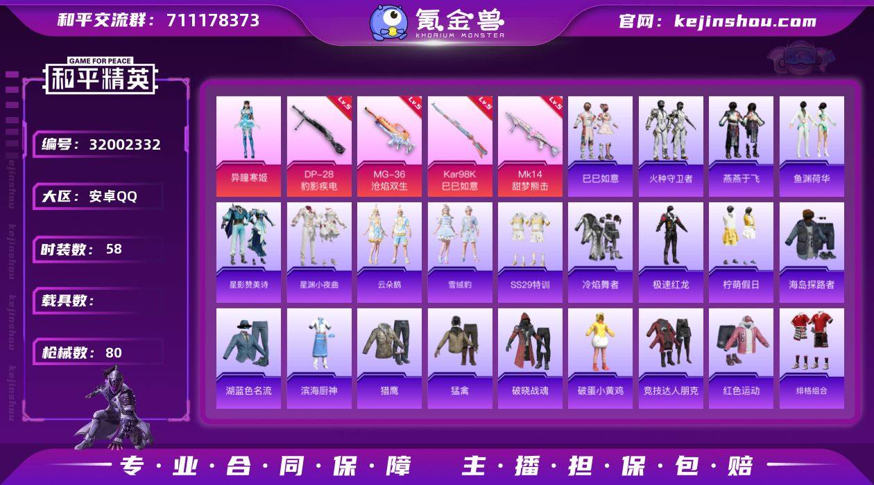 安卓 手Q-1粉装-4特效枪-0载具-1粉色飞行器-21170热力值-5王牌印记-58套装-80枪皮 【粉色套装】:角色-异瞳寒姬 【粉色枪皮等级】:Kar98K-巳巳如意(五级),Mk14-甜梦熊击(五级),DP-28-豹影疾电(五级),MG-36-沧焰双生(五级) 【粉色枪皮】:Kar98K-巳巳如意,Mk14-甜梦熊击,DP-28-豹影疾电,MG-36-沧焰双生 【粉色降落伞】:恐龙拽拽降落伞,异瞳寒姬降落伞,炫彩糖果降落伞 【稀有套装】:套装-巳巳如意,套装-火种守卫者,套装-燕燕于飞,套装-鱼渊荷华,套装-星影赞美诗,套装-星渊小夜曲,套装-云朵鹅,套装-雪绒豹,套装-炫彩糖果 【稀有枪皮】:AUG-冰晶雪宝,AKM-破晓战魂,AKM-龙的传人,SCAR-L-夜灯,SCAR-L-炫彩节奏,SCAR-L-玉兔迎春,SCAR-L-红色方程式,M416-红色方程式,GROZA-恐龙拽拽,AUG-天降萌叽,QBZ-彩虹符号,M762-彩虹符号,M762-云朵鹅,Mk47-炫光之旅,蜜獾-天降萌叽,UZI-啾咪啾咪,UZI-天降萌叽,Vector-生命誓言,P90-巳巳如意,Kar98K-星穹咏叹调,SVD-云朵鹅,S686-巳巳如意,DBS-幻彩电音,SPAS-12-云朵鹅,DP-28-彩虹符号,MG3-幻世战舞者,短管霰弹-星穹咏叹调,沙漠之鹰-云朵鹅,大砍刀-云朵鹅,破片手榴弹-巳巳如意 【其他套装】:套装-SS29特训,套装-冷焰舞者,套装-极速红龙,套装-柠萌假日,套装-海岛探路者,套装-湖蓝色名流,套装-滨海厨神,套装-猎鹰,套装-猛禽,套装-破晓战魂,套装-破蛋小黄鸡,套装-竞技达人朋克,套装-红色运动,套装-绯格组合,套装-缤纷果语,套装-蓝色运动,套装-都市魅力,套装-酒红色名流,套装-长空猛禽,套装-青涩时光,套装-魅力单车,套装-鹤鸣,套装-黄色名流,套装-黄色运动,套装-黑色伏地魔,套装-龙的传人,套装-莱茵河畔 【营地ID】:1028684790