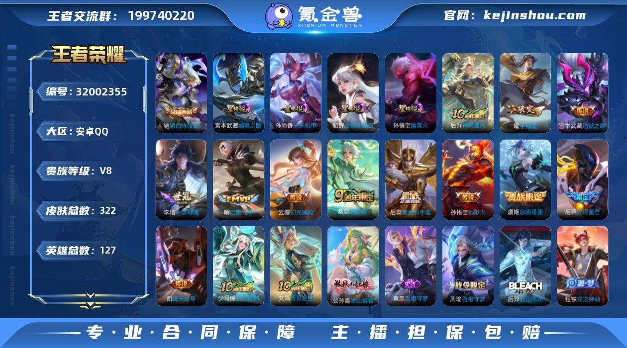 【特价急出/详情看图】安卓Q-V8-最强王者段位-127英雄-322皮肤-1典藏皮肤-4星元-12传说-95史诗 【英雄全皮】:刘禅全皮,空空儿全皮,影全皮 【荣耀典藏】:铠银白咏叹调 【传说皮肤】:后羿神树通天,云缨幻光神枪,桑启鸣野蒿,后羿无尽星芒,曜李逍遥 ,铠绛天战甲,虞姬启明星使,曜云鹰飞将,李信一念神魔,后羿黄金射手座,宫本武藏地狱之眼,孙悟空地狱火 【限定皮肤】:蔡文姬夏日便利店,虞姬夏日便利店,姜子牙天穹之誓,狄仁杰阴阳师,赵云皇家上将,赵云引擎之心,墨子神迹守卫,孙尚香蔷薇恋人,庄周高山流水,白起夜都怪侠,元歌云间偶戏,元歌无心,夏侯惇朔风刀,马可波罗逐梦之星,马可波罗暗影游猎,狄仁杰魔术师,狄仁杰万华元夜,达摩星际陆战队,达摩沙漠行僧,项羽海滩派对,老夫子醍醐杖,老夫子航海奇遇记,关羽冰锋战神,程咬金演武夺筹,韩信傲雪梅枪,王昭君午后时光,兰陵王金庭之子,亚瑟潮玩骑士王,孙悟空大圣娶亲,孙悟空孙行者,后羿圣弓游侠,后羿无尽星芒,李元芳云中旅人,虞姬启明星使,钟馗驱傩正仪,干将莫邪胡桃夹子,干将莫邪真爱魔法,雅典娜单词大作战,雅典娜黎明之约,鬼谷子原初探秘者,鬼谷子五谷丰年,铠青龙志,苏烈千军破阵,百里玄策原初追逐者,弈星混沌棋,沈梦溪大漠名商,明世隐疑决卦,明世隐吟游魔法,裴擒虎李小龙,裴擒虎擒涛扼浪,狂铁电玩高手,米莱狄胡桃异想国,云中君纤云弄巧,猪八戒西部大镖客,上官婉儿梁祝,嫦娥拒霜思,嫦娥暖冬兔眠,曜李逍遥 ,西施玲珑珍味,蒙犽狂想玩偶喵,鲁班大师探海日志,桑启海盐诗旅,暃星界游侠,戈娅驭风魔法,艾琳流音漫舞,司空震地狱燃心,阿古朵江河有灵,张良古海寻踪,蒙恬荣光圣徽,高渐离燃音魔法,妲己灵卜魔法,鬼谷子天穹祈灯,沈梦溪龙舞盛年,刘邦剑破天穹,程咬金群星魔术团,镜青焰无极,项羽...