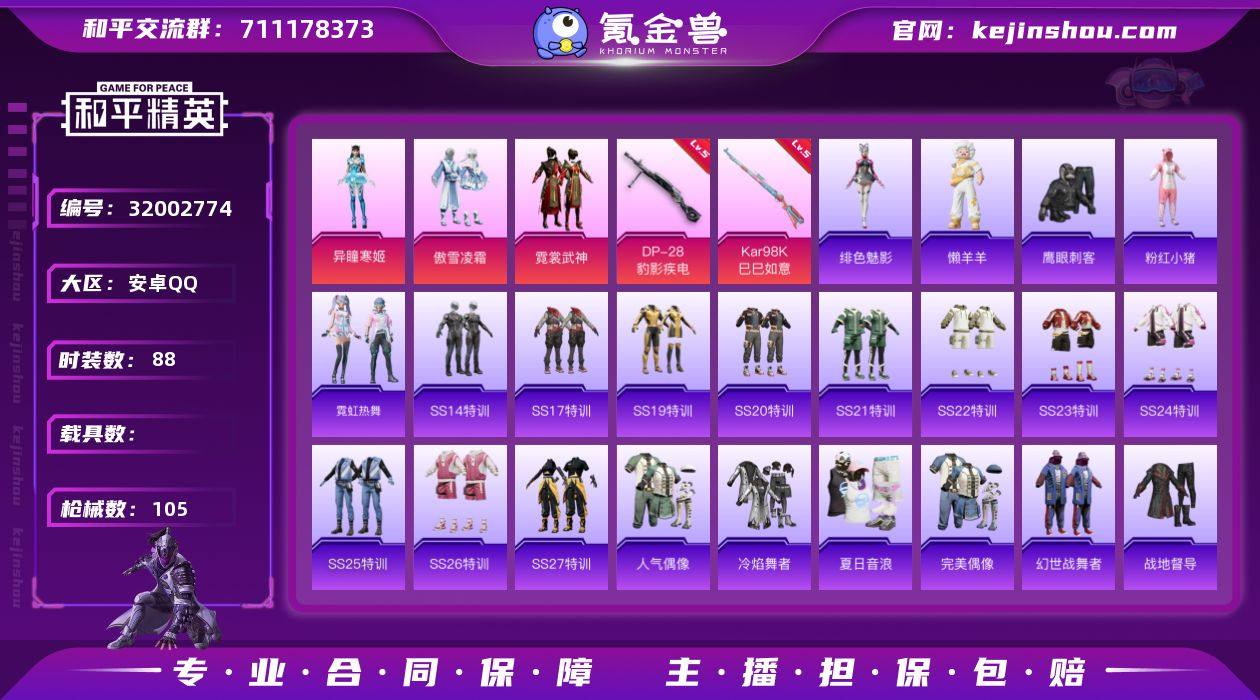 【特价出售/店主推荐】安卓 手Q-3粉装-2特效枪-0载具-1粉色飞行器-29267热力值-4王牌印记-88套装-105枪皮 【热门品类】:套装-粉红小猪 【粉色套装】:粉装-傲雪凌霜,粉装-霓裳武神,角色-异瞳寒姬 【粉色枪皮等级】:Kar98K-巳巳如意(五级),DP-28-豹影疾电(五级) 【粉色枪皮】:Kar98K-巳巳如意,DP-28-豹影疾电 【粉色降落伞】:精灵梦叶罗丽降落伞,喜羊羊与灰太狼降落伞,炫彩糖果降落伞 【稀有套装】:套装-霓虹热舞,玩偶服-懒羊羊,角色-绯色魅影,套装-炫彩糖果 【稀有枪皮】:AUG-冰晶雪宝,AKM-夜灯,AKM-环太平洋,AKM-生命誓言,AKM-破晓战魂,AKM-虎虎生威,M16A4-幻世战舞者,SCAR-L-暗夜玫瑰,SCAR-L-炫彩节奏,SCAR-L-玉兔迎春,M416-糯团青竹,M416-蓝色火焰,GROZA-彩虹符号,AUG-耀粉歌者,QBZ-彩虹符号,M762-天降萌叽,Mk47-妙红点点,G36C-星穹咏叹调,AC-VAL-天降萌叽,蜜獾-娇憨猪猪,UZI-啾咪啾咪,UZI-娇憨猪猪,UZI-炫彩节奏,UMP45-生命誓言,UMP45-蓝色火焰,Vector-彩虹符号,Vector-生命誓言,Vector-音爆索尼克,汤姆逊-天降萌叽,汤姆逊-环太平洋,汤姆逊-耀粉歌者,Kar98K-炫彩节奏,Kar98K-王子的夏天,AWM-海螺星光,AWM-音爆索尼克,SKS-炫彩节奏,Mini14-穿刺龙虾,Mini14-耀粉歌者,SLR-娇憨猪猪,AMR-妙红点点,S686-生命誓言,S686-红色方程式,S1897-炫彩节奏,S12K-瑞龙福将,S12K-破晓战魂,S12K-娇憨猪猪,S12K-幻世战舞者,DBS-彩虹符号,DBS-第五大道,M249-妙红点点,M249-彩虹符号,DP-28-彩虹符号,MG3-妙红点点,MG3-幻世战舞者,MG3-暗夜行者,爆炸猎弓-喜羊羊与灰太狼 【其他套装】:套装-SS14特训,套装-SS17特训,套装-SS19特训,套装-SS20特训,套装-SS21特训,套装-SS22特训,套装-SS23特训,套装-SS24特训,套装-SS25特训,套装-SS26特训,套装-SS27...