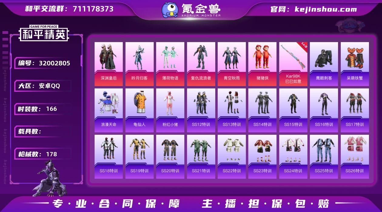 【特价出售/店主推荐】安卓 手Q-6粉装-1特效枪-0载具-1粉色飞行器-55196热力值-4王牌印记-166套装-178枪皮 【热门品类】:套装-浪漫天命,套装-龟仙人,套装-粉红小猪 【粉色套装】:粉装-深渊皇后,粉装-吟月归客,粉装-薄荷物语,角色-复仇流浪者,粉装-青空秋雨,玩偶服-猪猪侠 【粉色枪皮等级】:Kar98K-巳巳如意(五级) 【粉色枪皮】:Kar98K-巳巳如意 【粉色飞行器】:四圣焕新飞行器 【粉色降落伞】:梦幻火箭降落伞,蓝莓炮弹降落伞,碧影闪光降落伞,炙焰牛王降落伞,环太平洋降落伞,暖熊萌萌降落伞,绒雪飘舞降落伞,垂柳戏鸭降落伞,旋转彩虹降落伞,青空秋雨降落伞,第五大道降落伞,仲夏莫吉托降落伞 【稀有套装】:套装-龟仙人 【稀有枪皮】:AKM-夜灯,AKM-奇异狩猎者,AKM-生命誓言,AKM-破晓战魂,AKM-缤纷海域,AKM-萌趣颜团子,AKM-虎虎生威,AKM-霓虹街区,AKM-龙的传人,M16A4-夜灯,M16A4-幻世战舞者,M16A4-甜心亚梦,M16A4-红色方程式,M16A4-蓝色火焰,SCAR-L-夜灯,SCAR-L-炫彩节奏,SCAR-L-玉兔迎春,SCAR-L-红色方程式,SCAR-L-青丘仙客,SCAR-L-龙宫之主,M416-夜灯,M416-月影鸳鸯,M416-糯团青竹,M416-红色方程式,M416-蓝色火焰,GROZA-异彩先驱,GROZA-彩虹符号,GROZA-恐龙拽拽,GROZA-懵萌河马,GROZA-田园牧歌,GROZA-黑色刀锋,AUG-天降萌叽,AUG-幻影战神,AUG-耀粉歌者,QBZ-原初圣火,QBZ-彩虹符号,QBZ-电玩视界,QBZ-飞驰魅影,M762-天降萌叽,M762-奇异狩猎者,M762-彩虹甜喵,M762-牛气冲天,M762-瑞龙福将,M762-第五大道,M762-镭射皇者,Mk47-妙红点点,G36C-懵萌河马,G36C-时空追击者,AC-VAL-天降萌叽,AC-VAL-甜心亚梦,蜜獾-天降萌叽,蜜獾-娇憨猪猪,UZI-啾咪啾咪,UZI-娇憨猪猪,UZI-影袭,UZI-炫彩节奏,UZI-红色方程式,UMP45-时空追击者,UMP45-生命誓...