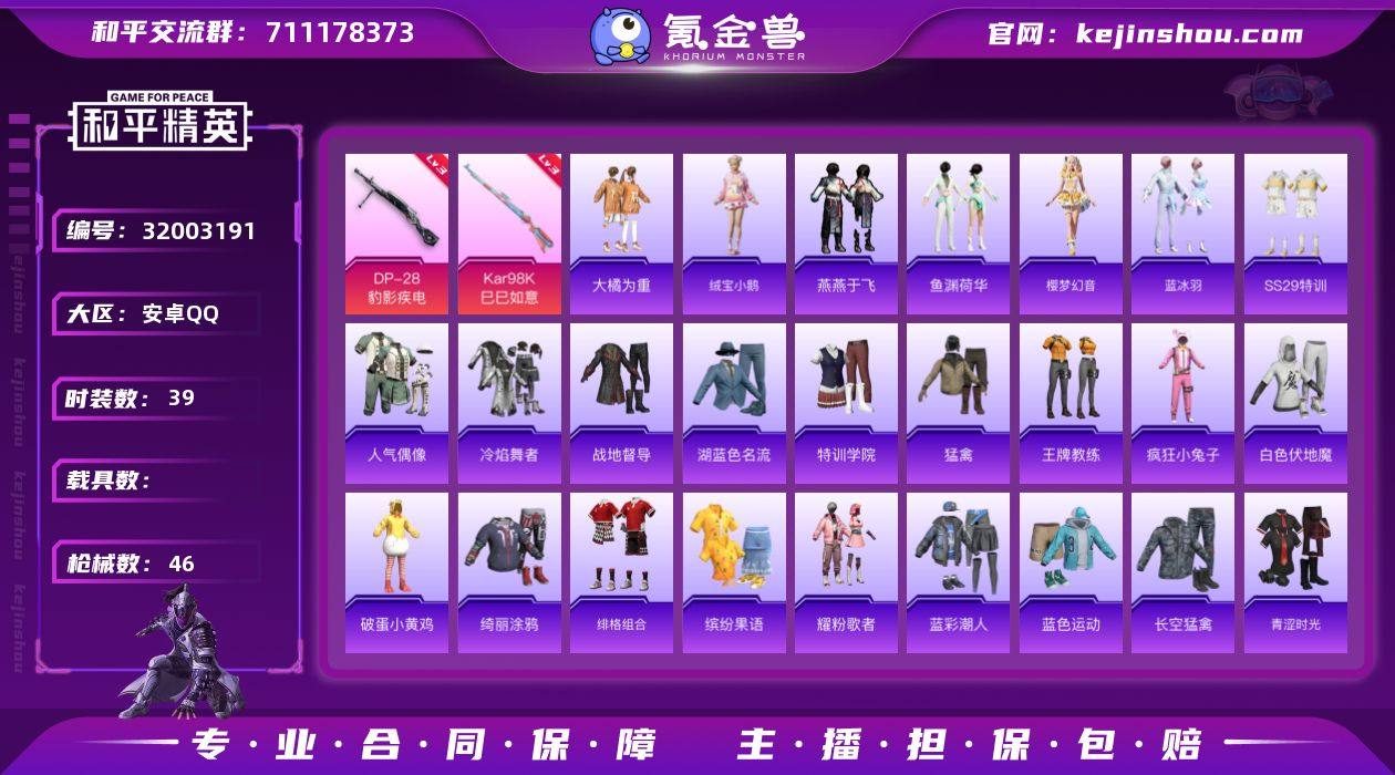 【特价出售/店主推荐】安卓 手Q-0粉装-4特效枪-0载具-0粉色飞行器-11658热力值-1王牌印记-39套装-46枪皮 【粉色枪皮等级】:ACE32-萌骑漫游(二级),Kar98K-巳巳如意(三级),Mk14-福马献瑞(四级),DP-28-豹影疾电(三级) 【粉色枪皮】:ACE32-萌骑漫游,Kar98K-巳巳如意,Mk14-福马献瑞,DP-28-豹影疾电 【粉色降落伞】:蜜语绒猫降落伞,金丰海韵降落伞,异瞳寒姬降落伞 【稀有套装】:套装-绒宝小鹅,套装-燕燕于飞,套装-鱼渊荷华,套装-樱梦幻音,套装-蓝冰羽,角色-霜纹水星 【稀有枪皮】:SCAR-L-炫彩节奏,M416-蓝色火焰,AUG-甜蜜菠萝,M762-天降萌叽,AC-VAL-天降萌叽,UMP45-夜灯,UMP45-蓝色火焰,汤姆逊-天降萌叽,汤姆逊-奇异狩猎者,汤姆逊-炫彩节奏,SKS-炫彩节奏,Mini14-耀粉歌者,莫辛纳甘-蜜语绒猫,S686-生命誓言,S12K-夜灯,DP-28-彩虹符号,MG3-幻世战舞者,TMP-9-萌萌史莱姆 【其他套装】:套装-SS29特训,套装-人气偶像,套装-冷焰舞者,套装-战地督导,套装-湖蓝色名流,套装-特训学院,套装-猛禽,套装-王牌教练,套装-疯狂小兔子,套装-白色伏地魔,套装-破蛋小黄鸡,套装-绮丽涂鸦,套装-绯格组合,套装-缤纷果语,套装-耀粉歌者,套装-蓝彩潮人,套装-蓝色运动,套装-长空猛禽,套装-青涩时光,套装-魅力单车,套装-黑色伏地魔,套装-水银刺客,套装-极地朋克,套装-大橘为重 【营地ID】:995642774