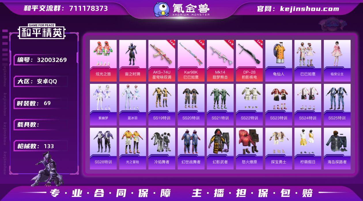 【特价出售/店主推荐】安卓 手Q-2粉装-6特效枪-0载具-1粉色飞行器-34109热力值-3王牌印记-69套装-133枪皮 【热门品类】:套装-龟仙人 【粉色套装】:粉装-炫光之旅,角色-宙之时溯 【粉色枪皮等级】:AKS-74U-星穹咏叹调(六级),Kar98K-巳巳如意(五级),Mk14-甜梦熊击(五级),DP-28-豹影疾电(四级) 【粉色枪皮】:ACE32-萌骑漫游,AKS-74U-星穹咏叹调,Kar98K-巳巳如意,Mk14-甜梦熊击,Mk14-福马献瑞,DP-28-豹影疾电 【粉色飞行器】:炫彩糖果飞行器 【粉色降落伞】:梦幻火箭降落伞,星之彼岸降落伞,彩虹甜喵降落伞,暗夜鎏金降落伞,星梦奇缘降落伞,初号机 觉醒Ver.降落伞,极意拳锋降落伞,炫彩糖果降落伞 【稀有套装】:套装-龟仙人,套装-巳巳如意,套装-炫彩糖果,角色-临安公主,套装-紫幽梦,套装-蓝冰羽 【稀有枪皮】:AUG-冰晶雪宝,AKM-彩虹符号,AKM-灼热熔岩,AKM-破晓战魂,AKM-龙的传人,M16A4-幻世战舞者,M16A4-甜心亚梦,M16A4-红色方程式,M16A4-蓝色火焰,SCAR-L-炫彩节奏,SCAR-L-玉兔迎春,SCAR-L-红色方程式,SCAR-L-银碳小老虎,M416-糯团青竹,M416-红色方程式,M416-蓝色火焰,GROZA-异彩先驱,GROZA-彩虹符号,AUG-天降萌叽,AUG-耀粉歌者,QBZ-彩虹符号,M762-天降萌叽,M762-彩虹甜喵,M762-彩虹符号,M762-牛气冲天,M762-第五大道,Mk47-炫光之旅,G36C-星穹咏叹调,AC-VAL-天降萌叽,AC-VAL-甜心亚梦,AC-VAL-闲梦青缨,蜜獾-天降萌叽,蜜獾-娇憨猪猪,UZI-啾咪啾咪,UZI-天降萌叽,UZI-娇憨猪猪,UZI-炫彩节奏,UZI-红色方程式,UMP45-蓝色火焰,Vector-生命誓言,汤姆逊-天降萌叽,汤姆逊-耀粉歌者,AKS-74U-鬼刀,P90-巳巳如意,Kar98K-梦幻火箭,Kar98K-红色方程式,M24-炫彩节奏,SKS-炫彩节奏,SKS-糯团青竹,VSS-星之彼岸,Mini14-涂山之恋,Mini14-耀粉歌者,SLR-娇...