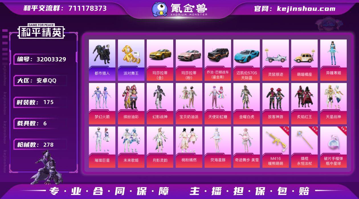 【特价出售/店主推荐】安卓 手Q-16粉装-20特效枪-6载具-7粉色飞行器-100496热力值-10王牌印记-175套装-278枪皮【热门品类】:粉装-梦幻火箭,粉装-缤纷油彩,套装-浪漫天命,套装-都市猎人,套装-派对舞王,套装-小丑鱼,套装-龟仙人,套装-暗影哥特【粉色套装】:粉装-幻影战神,粉装-宝贝奶油派,粉装-天使彩虹糖,粉装-金曜白虎,粉装-梦幻火箭,粉装-缤纷油彩,粉装-放客神游,粉装-炙焰红王,粉装-天星战神,粉装-璀璨巨星,粉装-未来歌姬,角色-月影灵韵,粉装-桃粉嫣然,角色-荧海星豚,角色-奇迹舞步 美雪,角色-异瞳寒姬【粉色枪皮等级】:AKM-甜心宝贝(五级),SCAR-L-梦幻火箭(五级),M416-五爪金龙(一级),M416-暖熊萌萌(七级),AUG-南国舞曲(四级),汤姆逊-热量炸弹(五级),AKS-74U-森灵之息(五级),Kar98K-未来歌姬(四级),Kar98K-巳巳如意(五级),AWM-璀璨巨星(三级),Mk14-甜梦熊击(五级),Mk14-爆裂游戏(五级),Mk14-福马献瑞(四级),DP-28-豹影疾电(五级),MG3-梦幻舞会(六级),PKM-天星战神(三级),MG-36-沧焰双生(五级),撬棍-永恒法杖(七级),镰刀-幽影之判(六级),破片手榴弹-瓶中星球(七级)【粉色载具】:玛莎拉蒂Ghibli(金),玛莎拉蒂Ghibli(粉),乔治巴顿战车(鎏金黑),迈凯伦570S(天际蓝),灵鼠银迹,萌喵橘座,僚机-萌兔起飞【粉色枪皮】:AKM-甜心宝贝,SCAR-L-梦幻火箭,M416-五爪金龙,M416-暖熊萌萌,AUG-南国舞曲,汤姆逊-热量炸弹,AKS-74U-森灵之息,Kar98K-未来歌姬,Kar98K-巳巳如意,AWM-璀璨巨星,Mk14-甜梦熊击,Mk14-爆裂游戏,Mk14-福马献瑞,DP-28-豹影疾电,MG3-梦幻舞会,PKM-天星战神,MG-36-沧焰双生,撬棍-永恒法杖,镰刀-幽影之判,破片手榴弹-瓶中星球【粉色飞行器】:炫彩糖果飞行器,梦幻火箭飞行器,黄族统领飞行器,璀璨巨星飞行器,月下星之子飞行...