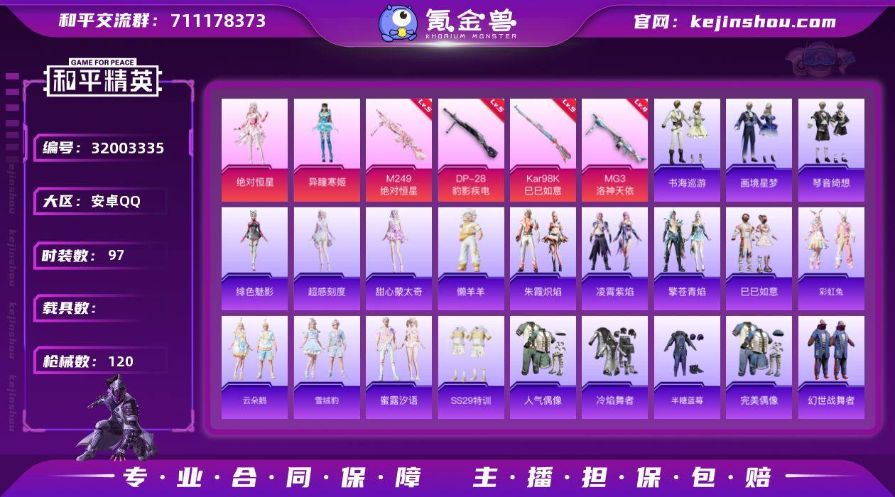 可二次【特价出售/店主推荐】安卓 手Q-2粉装-6特效枪-0载具-2粉色飞行器-31788热力值-5王牌印记-97套装-120枪皮 【粉色套装】:角色-绝对恒星,角色-异瞳寒姬 【粉色枪皮等级】:UMP45-萌骑冒险(一级),Kar98K-巳巳如意(五级),Mk14-福马献瑞(四级),M249-绝对恒星(五级),DP-28-豹影疾电(五级),MG3-洛神天依(四级) 【粉色枪皮】:UMP45-萌骑冒险,Kar98K-巳巳如意,Mk14-福马献瑞,M249-绝对恒星,DP-28-豹影疾电,MG3-洛神天依 【粉色飞行器】:绝对恒星飞行器,炫彩糖果飞行器 【粉色降落伞】:绝对恒星降落伞,洛神天依降落伞,熔岩统帅降落伞,荧海星豚降落伞,异瞳寒姬降落伞,炫彩糖果降落伞 【稀有套装】:套装-巳巳如意,角色-超感刻度,角色-甜心蒙太奇,套装-雪国风尚,套装-炫彩糖果,套装-马上有钱,套装-彩虹兔,套装-云朵鹅,套装-雪绒豹,套装-蜜露汐语,套装-朱霞炽焰,套装-凌霄紫焰,套装-擎苍青焰,玩偶服-懒羊羊,角色-绯色魅影,套装-书海巡游,套装-画境星梦,套装-琴音绮想,套装-雨过天青,套装-红釉青花 【稀有枪皮】:AUG-冰晶雪宝,AKM-破晓战魂,AKM-龙的传人,M16A4-幻世战舞者,SCAR-L-夜灯,SCAR-L-炫彩节奏,M416-蓝色火焰,GROZA-荧海星豚,AUG-耀粉歌者,AUG-绝对恒星,QBZ-洛神天依,M762-天降萌叽,M762-云朵鹅,M762-登顶巅峰,Mk47-洛神天依,ACE32-画境星梦,ARX-凌霄紫焰,UZI-天降萌叽,UMP45-夜灯,Vector-生命誓言,MP5K-画境星梦,JS9-凌霄紫焰,P90-巳巳如意,Kar98K-洛神天依,M24-炫彩节奏,M24-仲夏莫吉托,AMR-喜羊羊与灰太狼,SVD-云朵鹅,M1加兰德-画境星梦,S686-雪月幻音,S686-巳巳如意,S686-千金淑猫,S12K-夜灯,DBS-彩虹符号,AA12-G-画境星梦,SPAS-12-云朵鹅,M249-彩虹符号,MG3-折梦之诗,MG-36-凌霄紫焰,P92-凌霄紫焰,沙漠之鹰-云朵鹅,F57-...