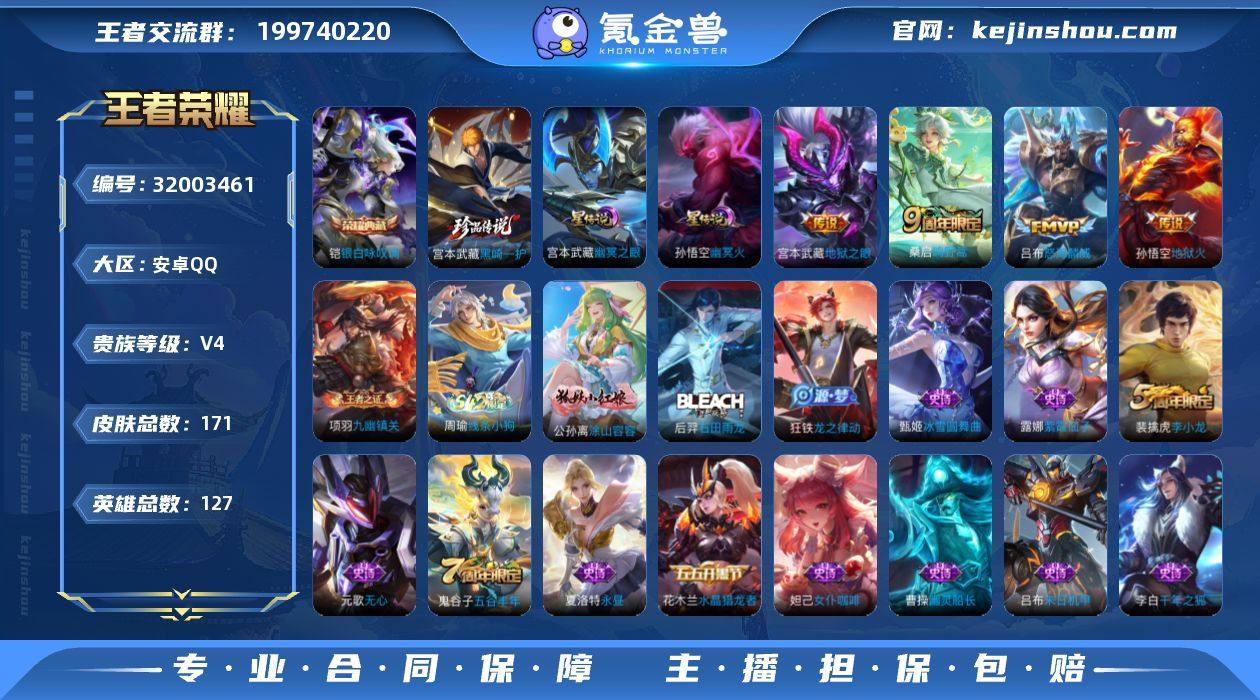 可二次【特价出售/店主推荐/3市标/】:安卓Q-V6-最强王者段位-127英雄-171皮肤-1典藏皮肤-1珍品传说-2星元-4传说-46史诗 【荣耀典藏】:铠银白咏叹调 【珍品传说】:宫本武藏黑崎一护 【传说皮肤】:桑启鸣野蒿,吕布怒海麟威,宫本武藏地狱之眼,孙悟空地狱火 【限定皮肤】:白起狰,蒙犽顽岩魄,姜子牙天穹之誓,杨戬破阵退雄兵,狄仁杰阴阳师,赵云皇家上将,墨子神迹守卫,嬴政优雅恋人,孙尚香蔷薇恋人,白起夜都怪侠,元歌无心,夏侯惇朔风刀,典韦穷奇,狄仁杰魔术师,达摩沙漠行僧,项羽海滩派对,老夫子航海奇遇记,程咬金演武夺筹,兰陵王金庭之子,牛魔御旌,李元芳云中旅人,钟馗驱傩正仪,鬼谷子五谷丰年,弈星混沌棋,沈梦溪大漠名商,明世隐疑决卦,明世隐吟游魔法,裴擒虎李小龙,米莱狄御霄,云中君纤云弄巧,鲁班大师探海日志,阿古朵江河有灵,张良古海寻踪,蒙恬荣光圣徽,鬼谷子天穹祈灯,沈梦溪龙舞盛年,刘邦剑破天穹,程咬金群星魔术团,周瑜熔金海岸 【赛季限定】:白起狰,典韦穷奇,米莱狄御霄,牛魔御旌,夏侯惇朔风刀,弈星混沌棋,明世隐疑决卦,程咬金演武夺筹,钟馗驱傩正仪,达摩沙漠行僧,兰陵王金庭之子,沈梦溪大漠名商,李元芳云中旅人,鲁班大师探海日志,张良古海寻踪,鬼谷子天穹祈灯,刘邦剑破天穹,姜子牙天穹之誓,东皇太一噬灭天穹,太乙真人谧流熔炉,钟馗虚灵犬护,甄姬逆浪荇歌,亚瑟荣光之誓,蒙恬荣光圣徽,牛魔星界战将,项羽九幽镇关 【战令限定】:老夫子航海奇遇记,墨子神迹守卫,明世隐吟游魔法,白起夜都怪侠,周瑜线条小狗 【史诗皮肤】:周瑜线条小狗,项羽九幽镇关,公孙离涂山容容,后羿石田雨龙,狂铁龙之律动,牛魔星界战将,蒙犽顽岩魄,蒙恬荣光圣徽,阿古朵江河有灵,元歌无心,鬼谷子五谷丰年,明世隐吟游魔法,夏洛特永昼,老夫子航海奇遇记...